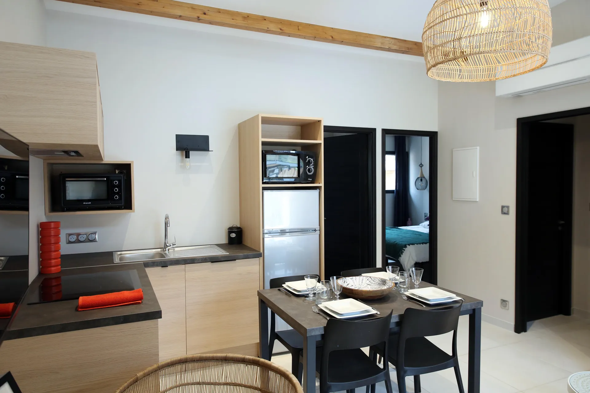 Vous êtes ici chez vous. Dans la belle cuisine fonctionnelle et ajourée, une plaque 3 feux vitro céramique, un évier inox, un lave-vaisselle, un four et four micro-onde, un réfrigérateur congélateur, une cafetière et tout le matériel de cuisine nécessaire.