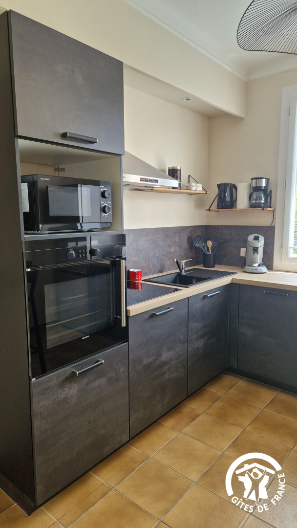 – cuisine équipée avec mange-debout. Réfrigérateur-congélateur, four, lave-vaisselle, micro-ondes, cafetière à filtre et à dosettes Senseo©…