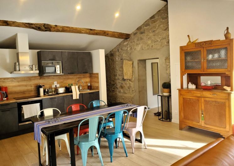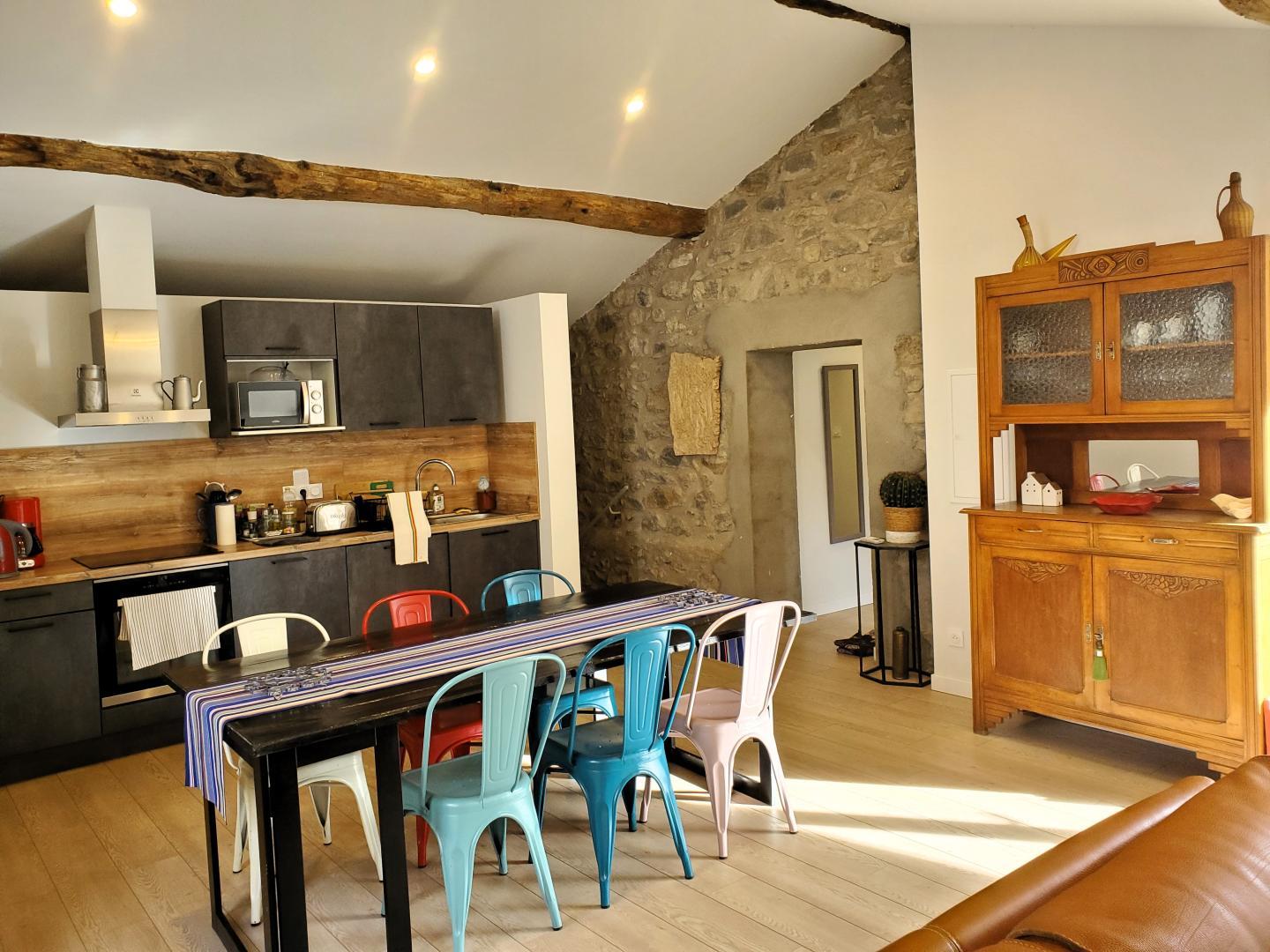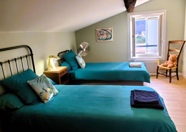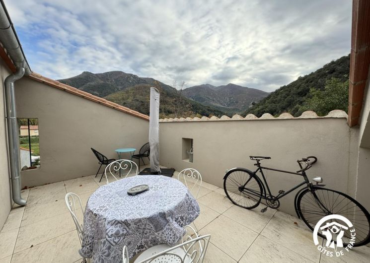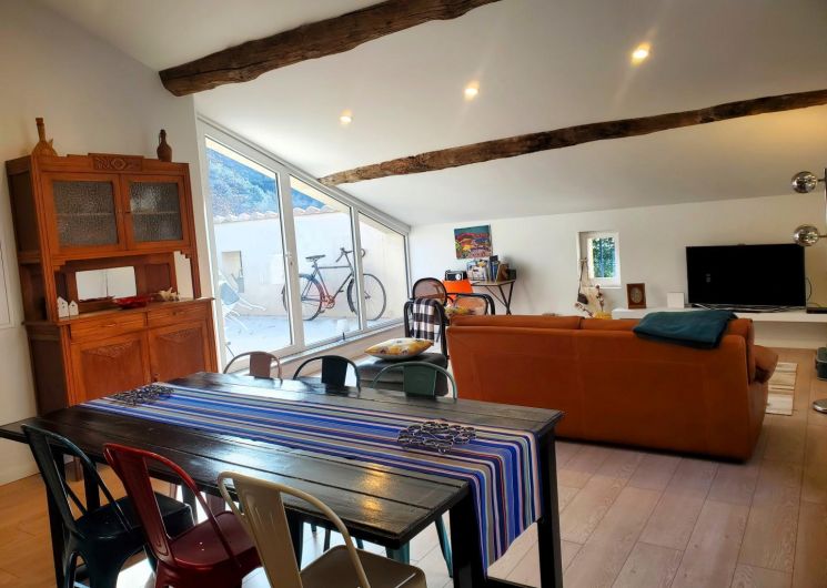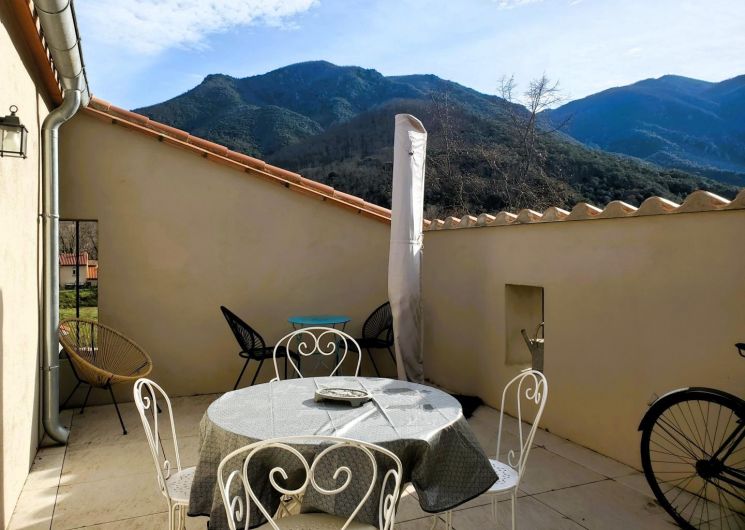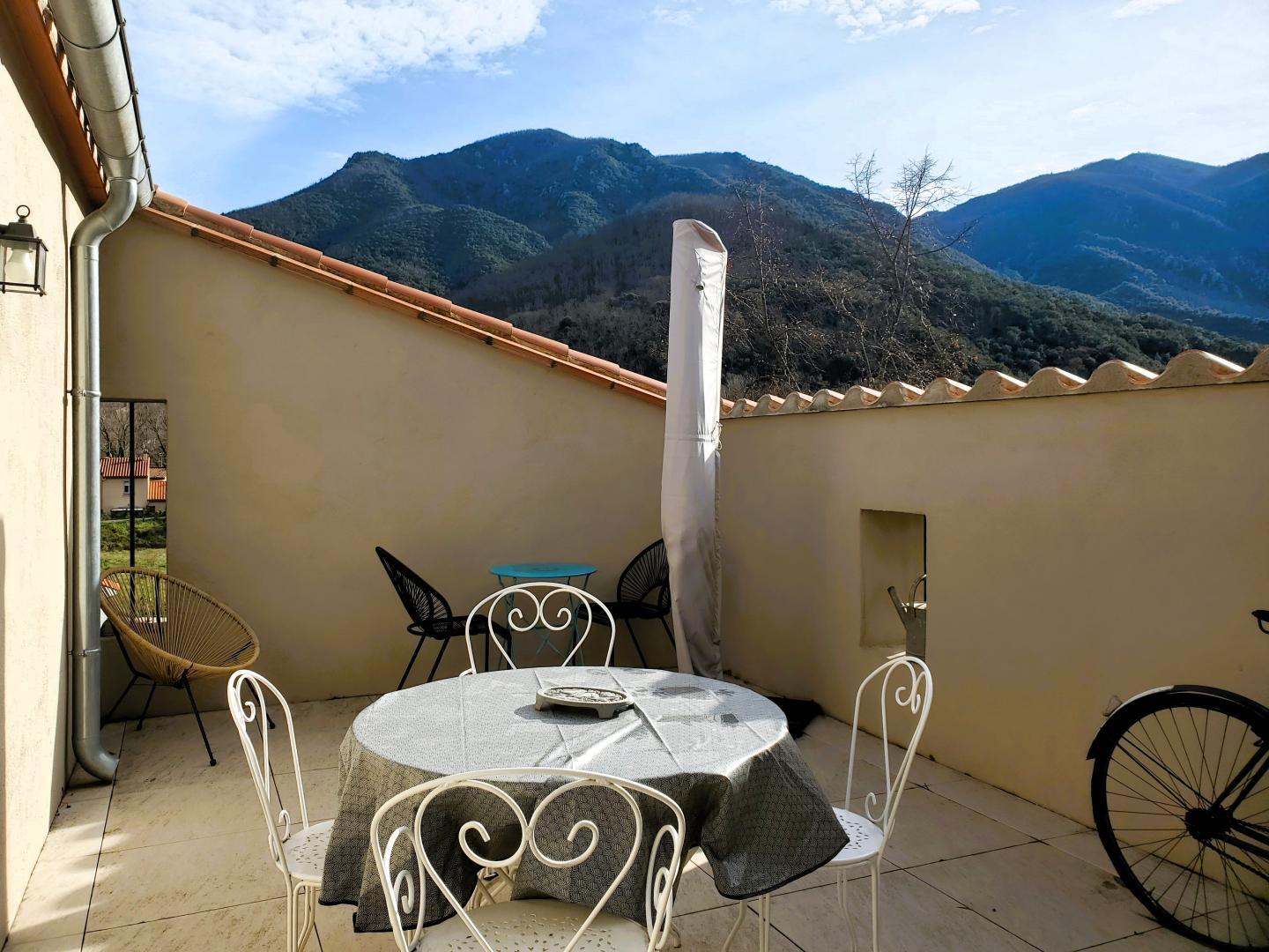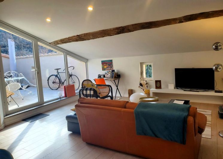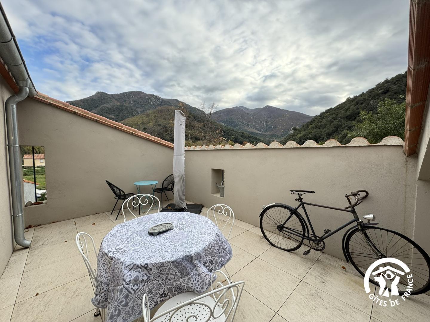 Cette maison mitoyenne, à l’ambiance traditionnelle se déploie sur un seul niveau. À l’étage, vous trouverez une pièce de vie chaleureuse composée d’un salon, d’une salle à manger et d’une cuisine ouverte, équipée d’une plaque à induction 3 foyers, d’une bouilloire, d’un grille-pain ainsi que de cafetières à filtre et Senseo. Deux chambres confortables complètent l’espace nuit : • Une chambre avec un lit double en 160×200 cm • Une chambre avec deux lits simples en 90×190 cm Pour votre confort, la pièce à vivre dispose de la climatisation, tandis que les chambres sont équipées de ventilateurs sur pied. Une salle d’eau est également à votre disposition. Le WC est indépendant. À l’extérieur, vous profiterez d’une agréable terrasse aménagée avec mobilier de jardin, parfaite pour vos repas en plein air ou vos moments de détente face aux paysages vallonnés du Vallespir. Deux places de stationnement sont réservées à proximité immédiate du gîte.