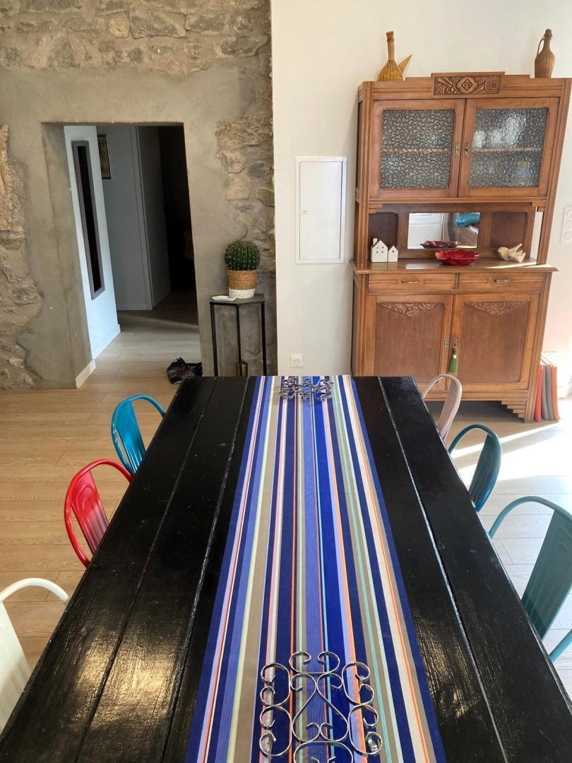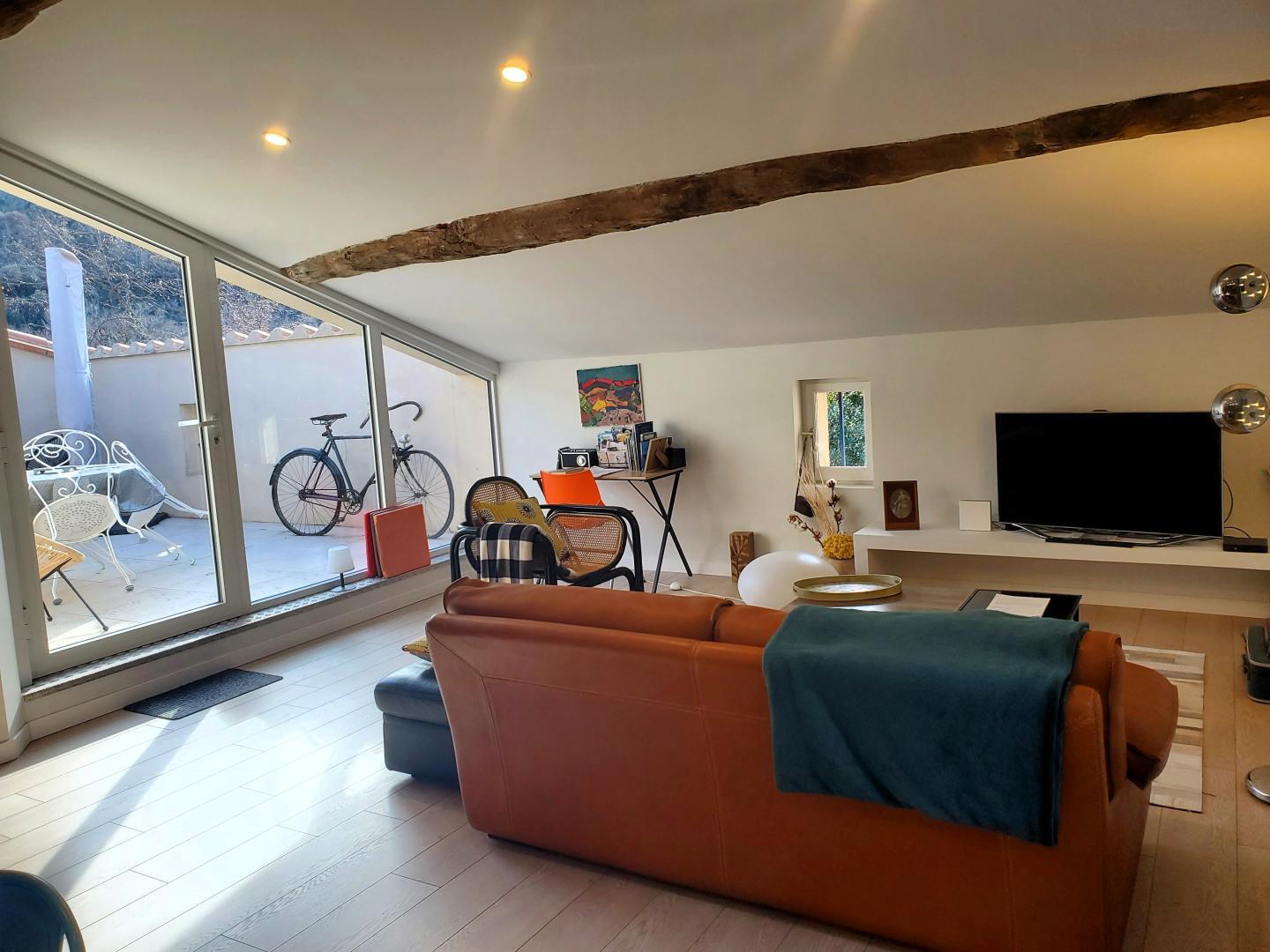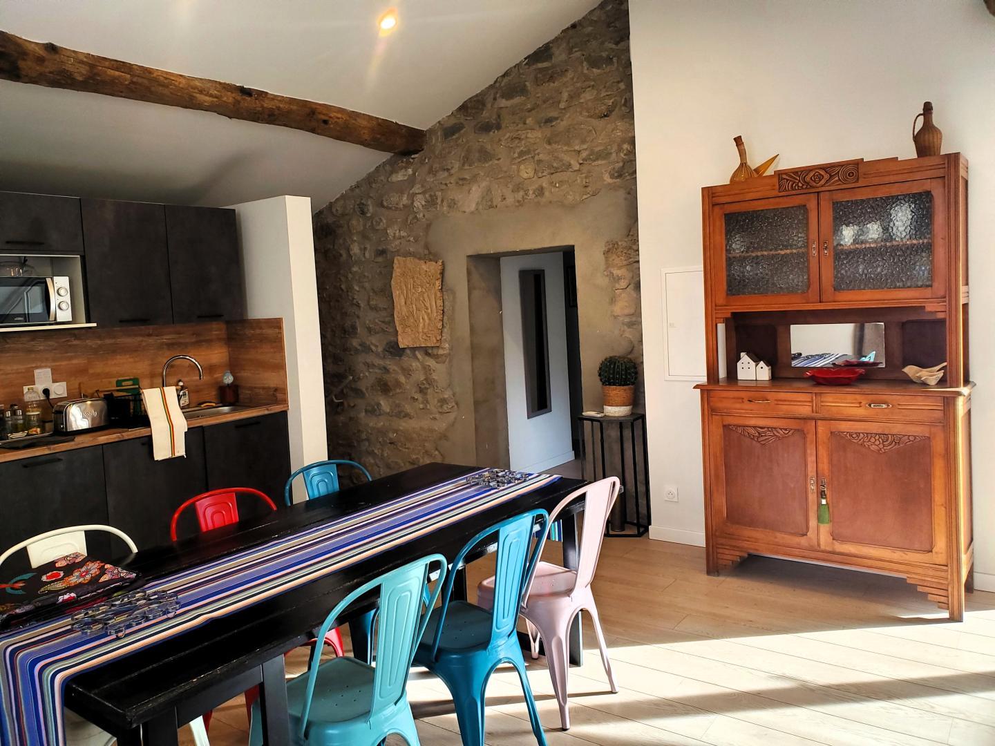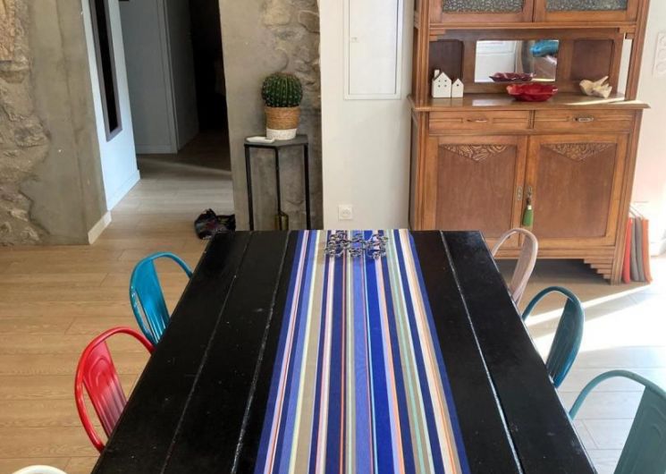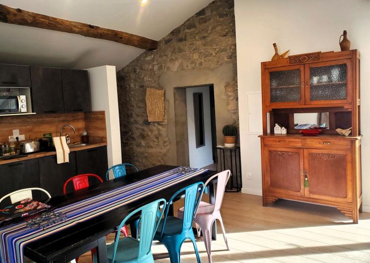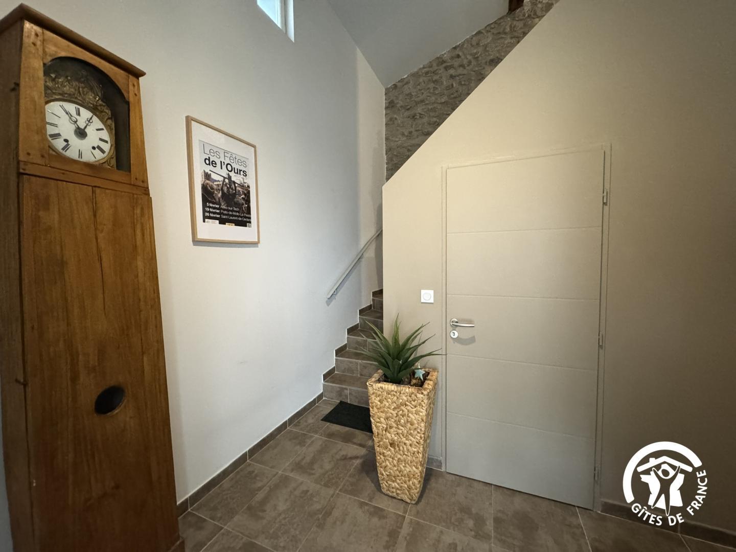 Cette maison mitoyenne, à l’ambiance traditionnelle se déploie sur un seul niveau. À l’étage, vous trouverez une pièce de vie chaleureuse composée d’un salon, d’une salle à manger et d’une cuisine ouverte, équipée d’une plaque à induction 3 foyers, d’une bouilloire, d’un grille-pain ainsi que de cafetières à filtre et Senseo. Deux chambres confortables complètent l’espace nuit : • Une chambre avec un lit double en 160×200 cm • Une chambre avec deux lits simples en 90×190 cm Pour votre confort, la pièce à vivre dispose de la climatisation, tandis que les chambres sont équipées de ventilateurs sur pied. Une salle d’eau est également à votre disposition. Le WC est indépendant. À l’extérieur, vous profiterez d’une agréable terrasse aménagée avec mobilier de jardin, parfaite pour vos repas en plein air ou vos moments de détente face aux paysages vallonnés du Vallespir. Deux places de stationnement sont réservées à proximité immédiate du gîte.
