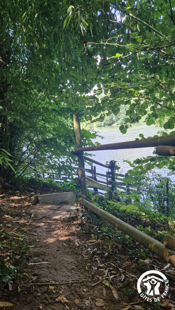 A l’extérieur : une terrasse vous attend avec son barbecue, table et chaises longues à l’ombre d’un grand cerisier. Au bout du jardin, derrière les bambous, un ponton privé, idéal pour les amateurs de pêche (pas de baignade possible). Prêt de cannes à pêche sur place. Terrain clos, possibilité de planter une tente dans le jardin, voitures garées à l’ombre à côté de la maison.