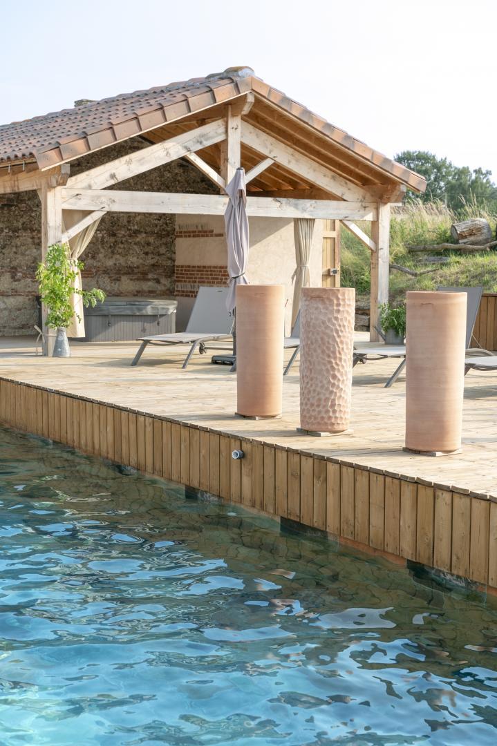 Tout ici a été pensé pour la détente : piscine chauffée (alarme), ouverte de mi-mai à fin septembre, solarium, jacuzzi 3 places, grande terrasse ombragée. Côté loisirs, Anne a aussi pensé à tout : boulodrome, terrains de volley et de badminton, prêt de vélos.