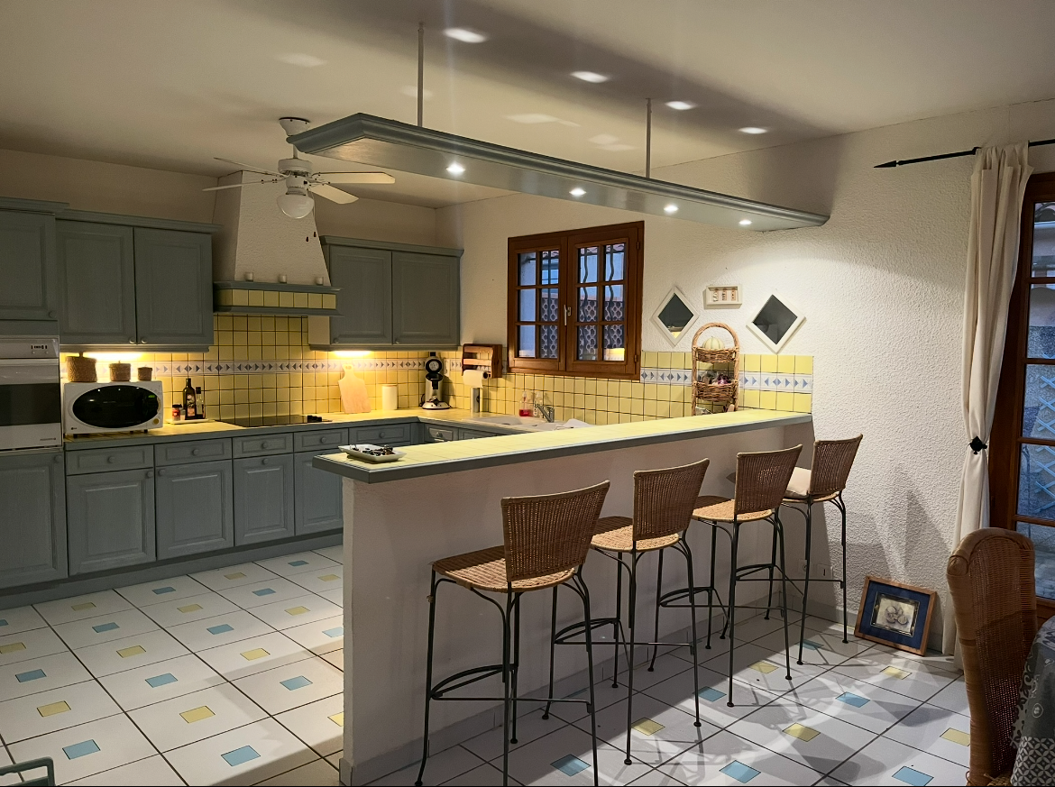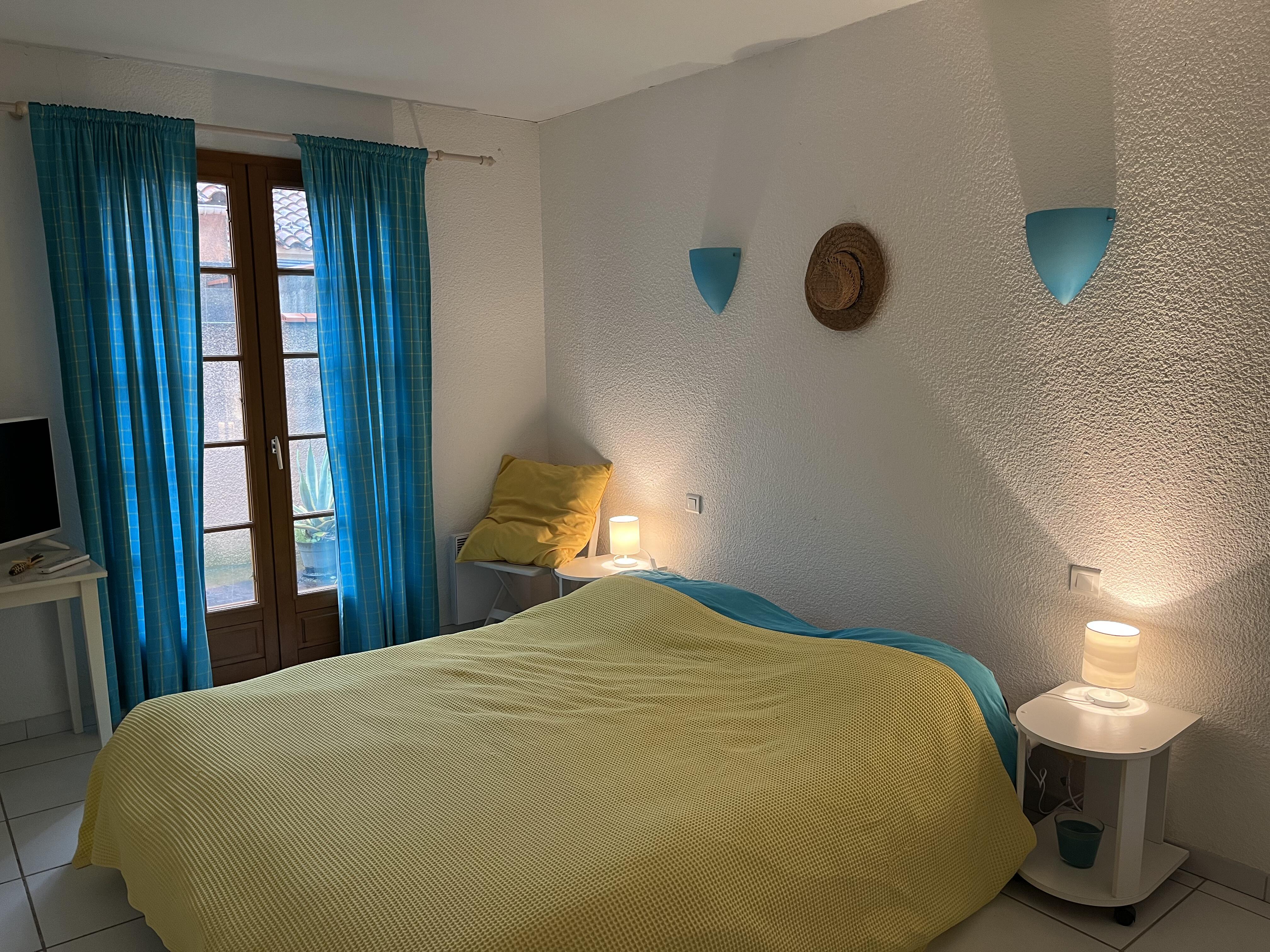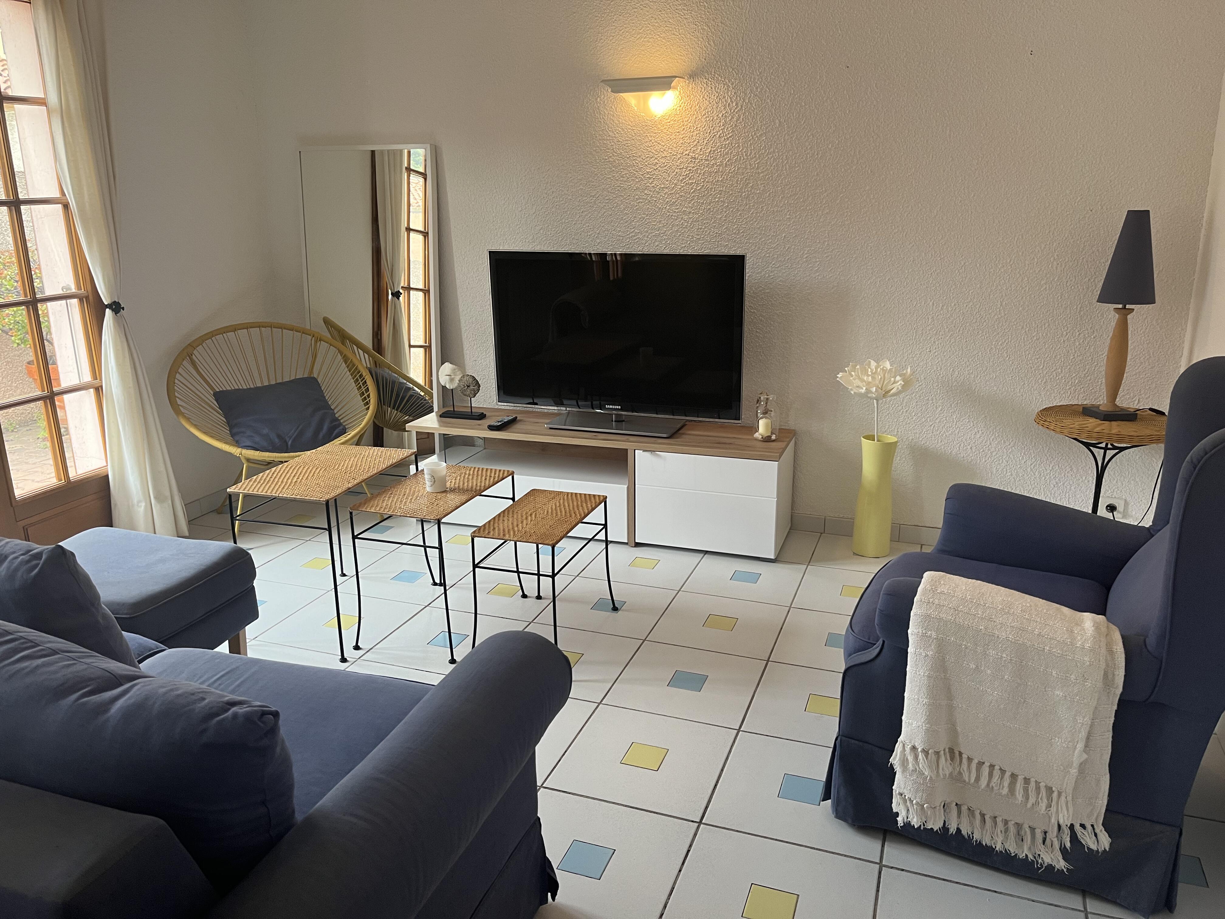 Maison de plain-pied à 700m de la plage pour 4/6 personnes. 2 chambres avec 2 lits 140cm plus canapé convertible. Grande pièce à vivre avec cuisine équipée ouverte. Parking/garage/terrasse/climatisation.