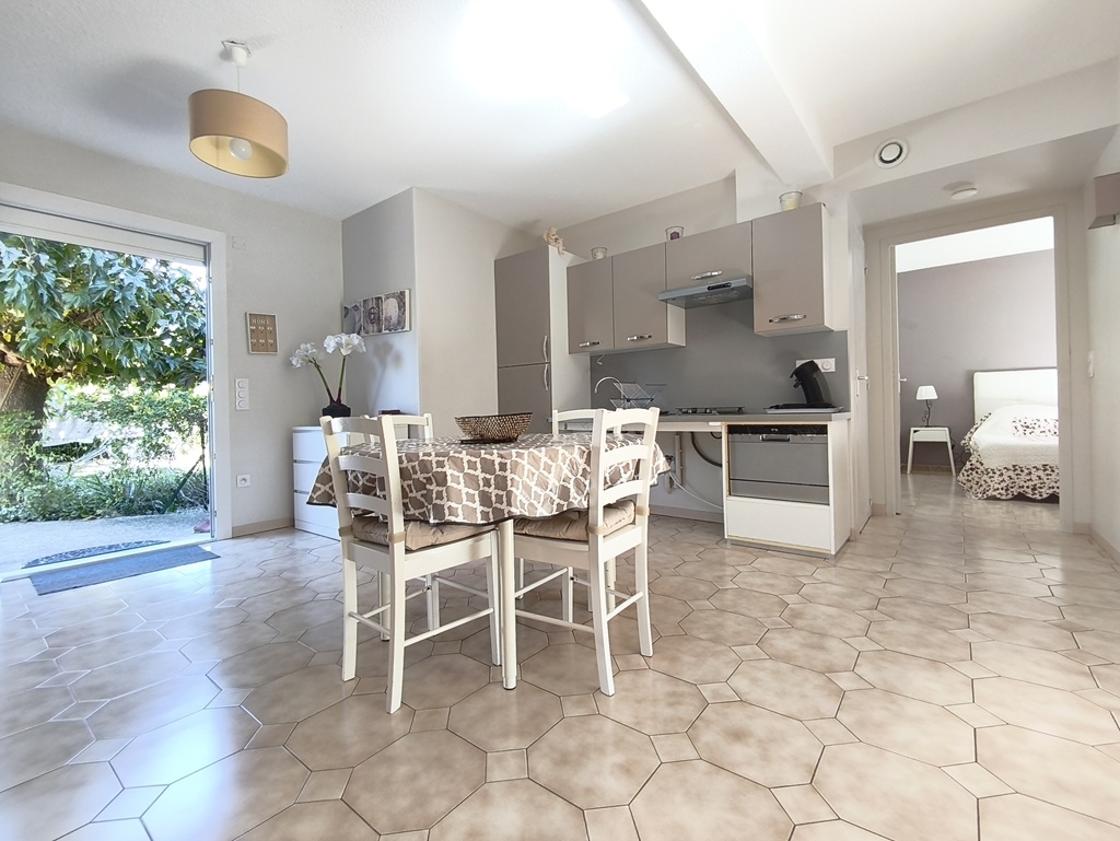 Dans Maison individuelle, appartement de 40 m² en rdc pour 2 personnes comprenant : Cuisine équipée (cafetière, micro-ondes combiné four, réfrigérateur-congélateur, lave-linge, lave-vaisselle…) salon avec canapé + tv. Wifi inclus. Une chambre Indépendante avec 2 lits jumeaux en 90 cm. Salle d’eau avec douche italienne et wc. Jardin Privatif avec terrasse, salon de jardin et transats. Stationnement privé et clos. Proximité des commerces et des thermes. Animaux non admis. Appartement non fumeur