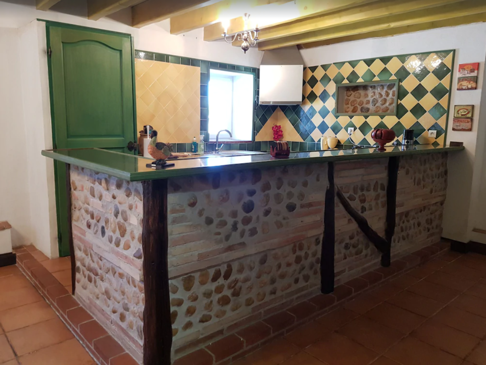 Rez-de-chaussée : grande pièce de vie (environ 60m²) avec coin salon, table à manger, cuisine ouverte toute équipée (réfrigérateur + freezer, lave-vaisselle, plaque de cuisson gaz, four, micro-ondes, cafetière, bouilloire, grille-pain…), wc, douche.