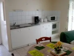 Le coin cuisine comprend un réfrigérateur, un maxi-four, un micro-ondes et une plaque électrique.