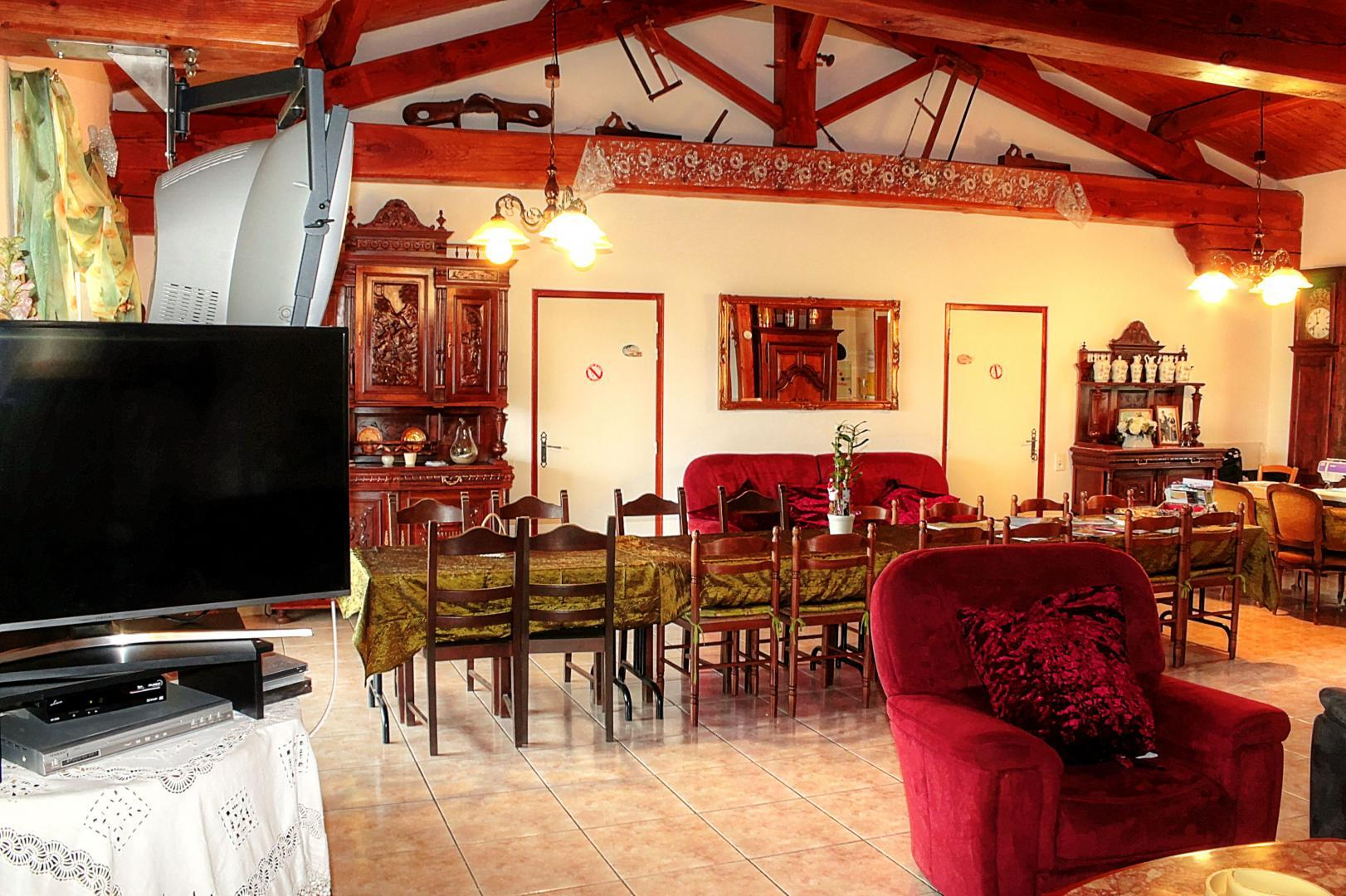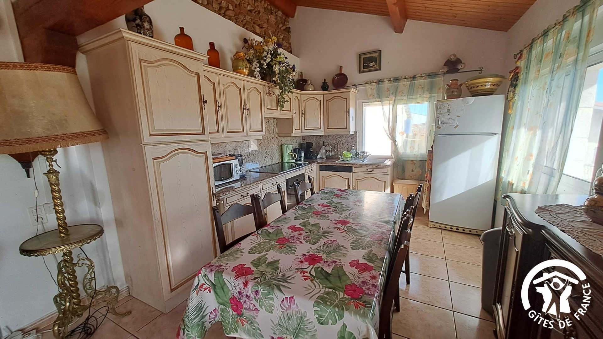 De plain pied : une immense pièce à vivre avec un coin cuisine, plan de travail en granit toute équipée, trois chambres : chacune avec un lit double et salle d’eau+ wc et une buanderie.