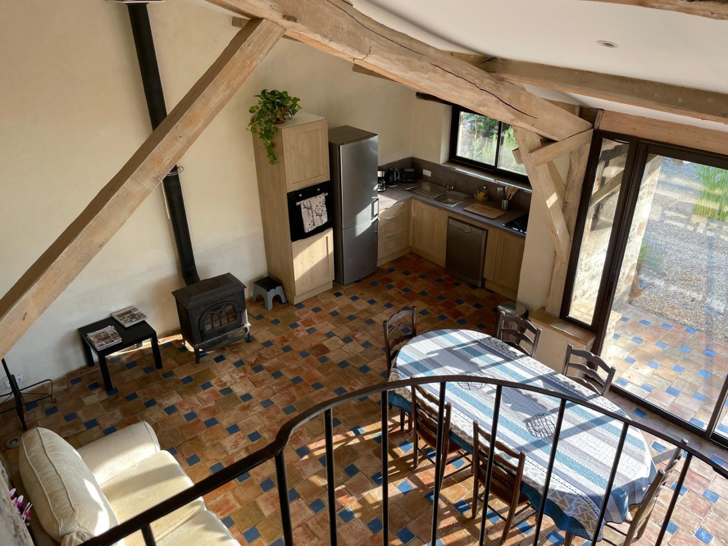 – pièce à vivre avec cuisine ouverte toute équipée, très lumineuse et donnant directement sur le jardin par de grandes baies vitrées (canapé, table et chaises), poêle à bois