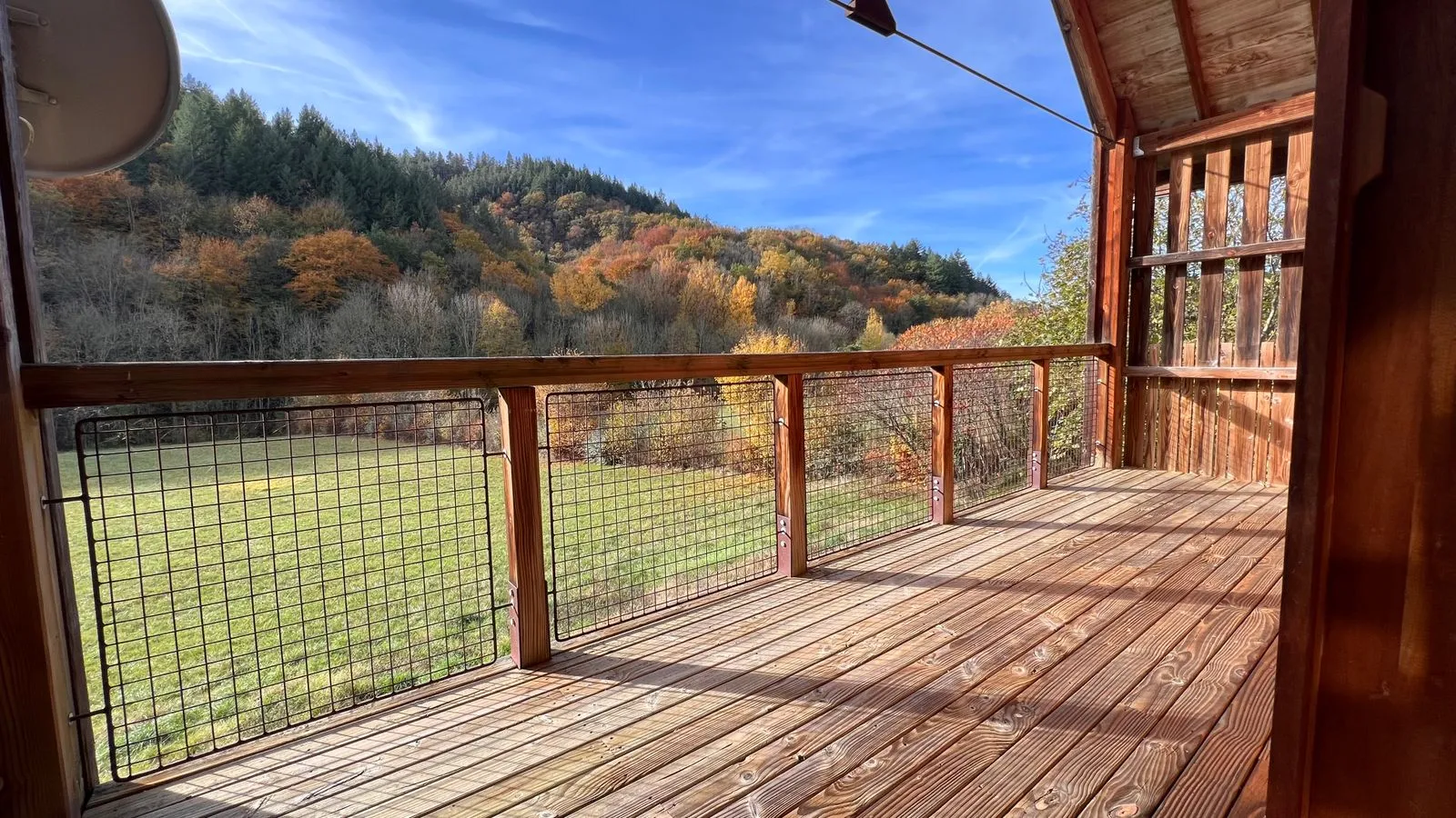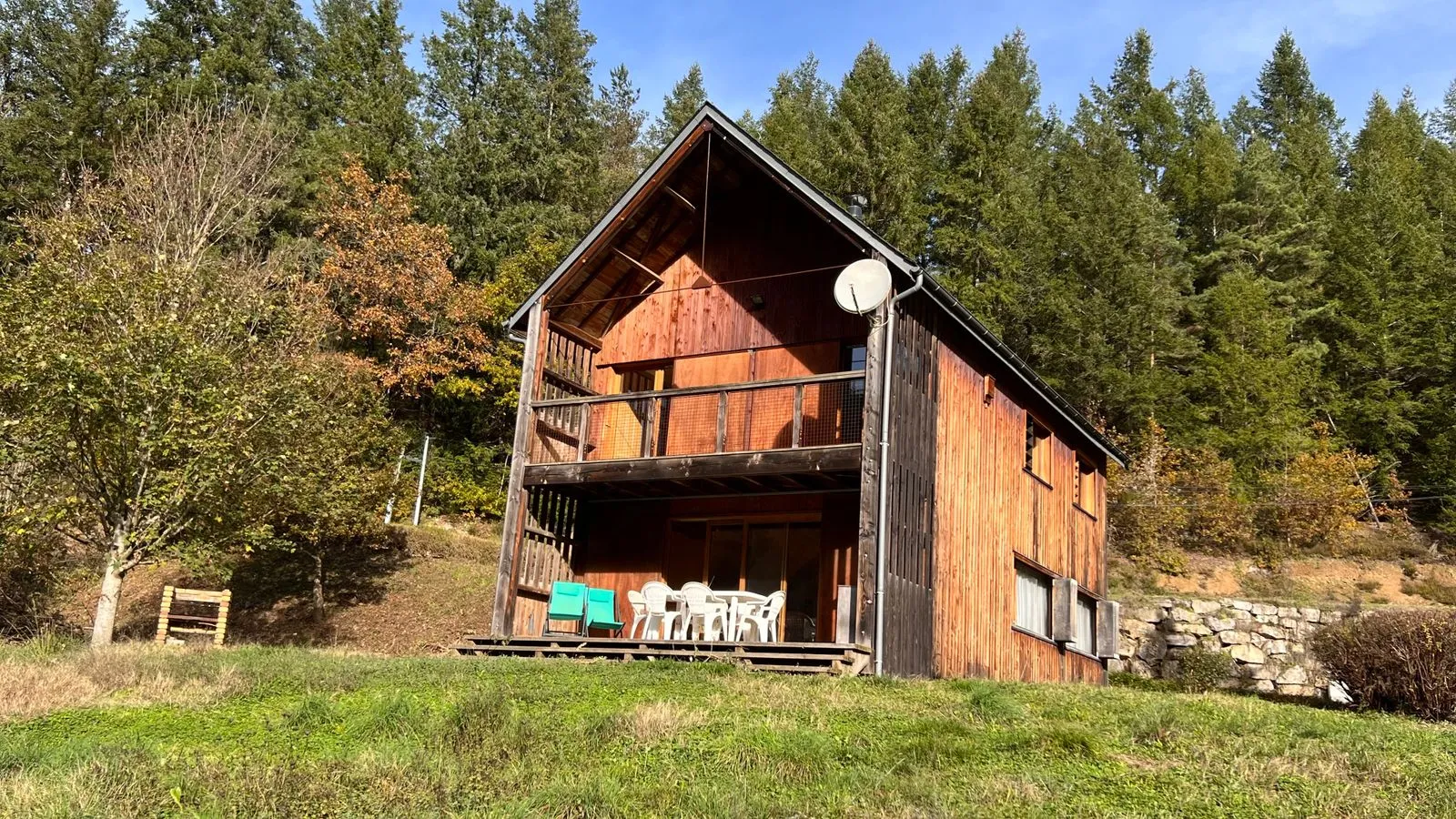 Le long d’une verdoyante petite vallée du Ségala, orienté vers les grands arbres qui bordent le pré et implanté en fond d’une prairie longeant une rivière, se dresse un gîte tout en bois, en pignon et à chaque étage : une terrasse couverte.