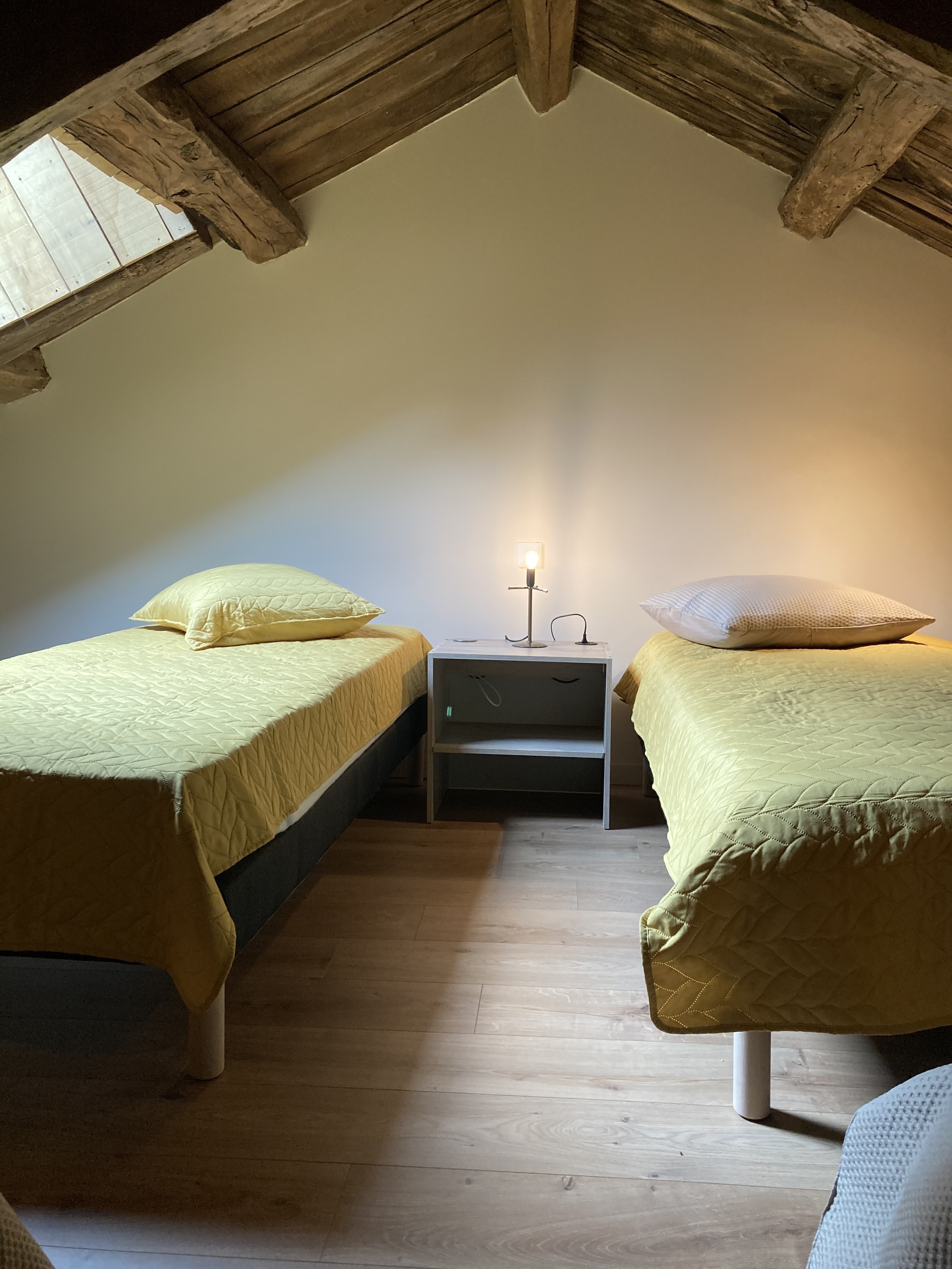– une grande chambre mansardée, façon dortoir avec deux lits d’une personne 90×190, 1 lit d’appoint 70×190.