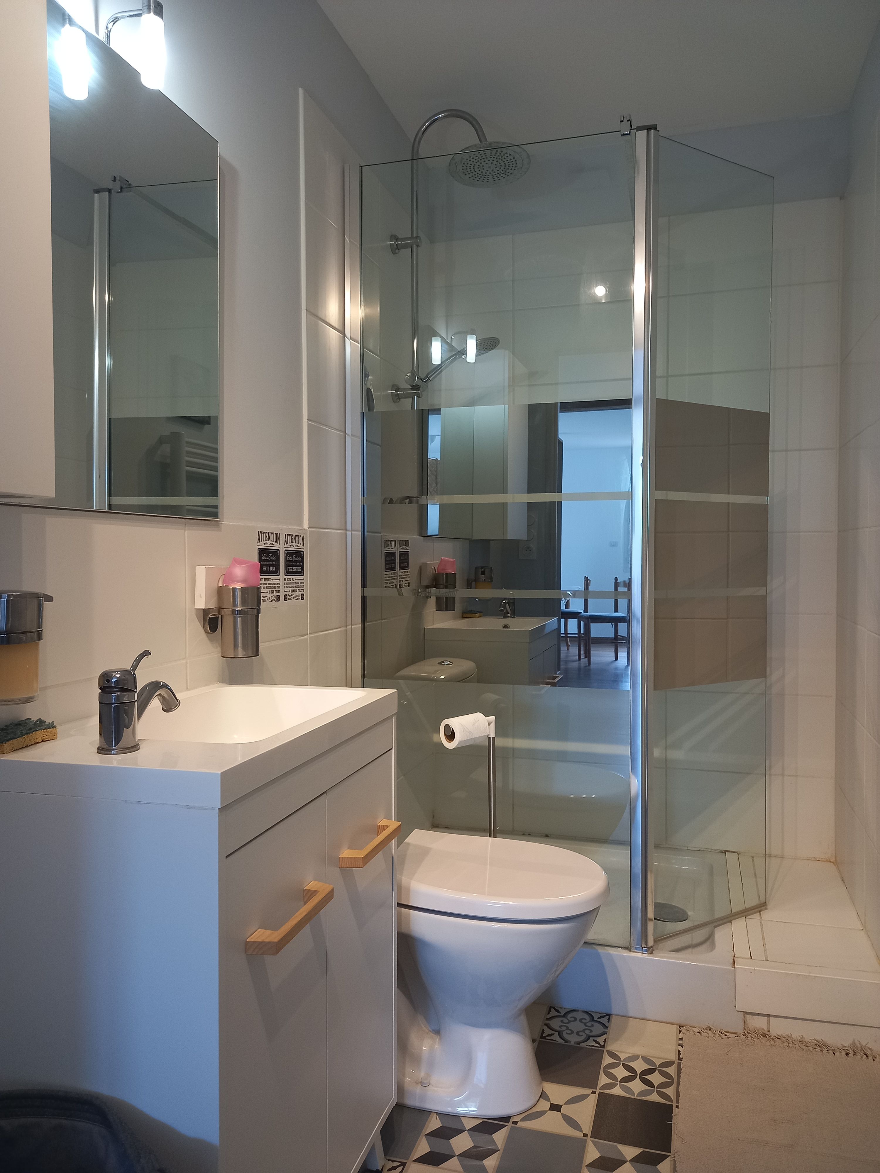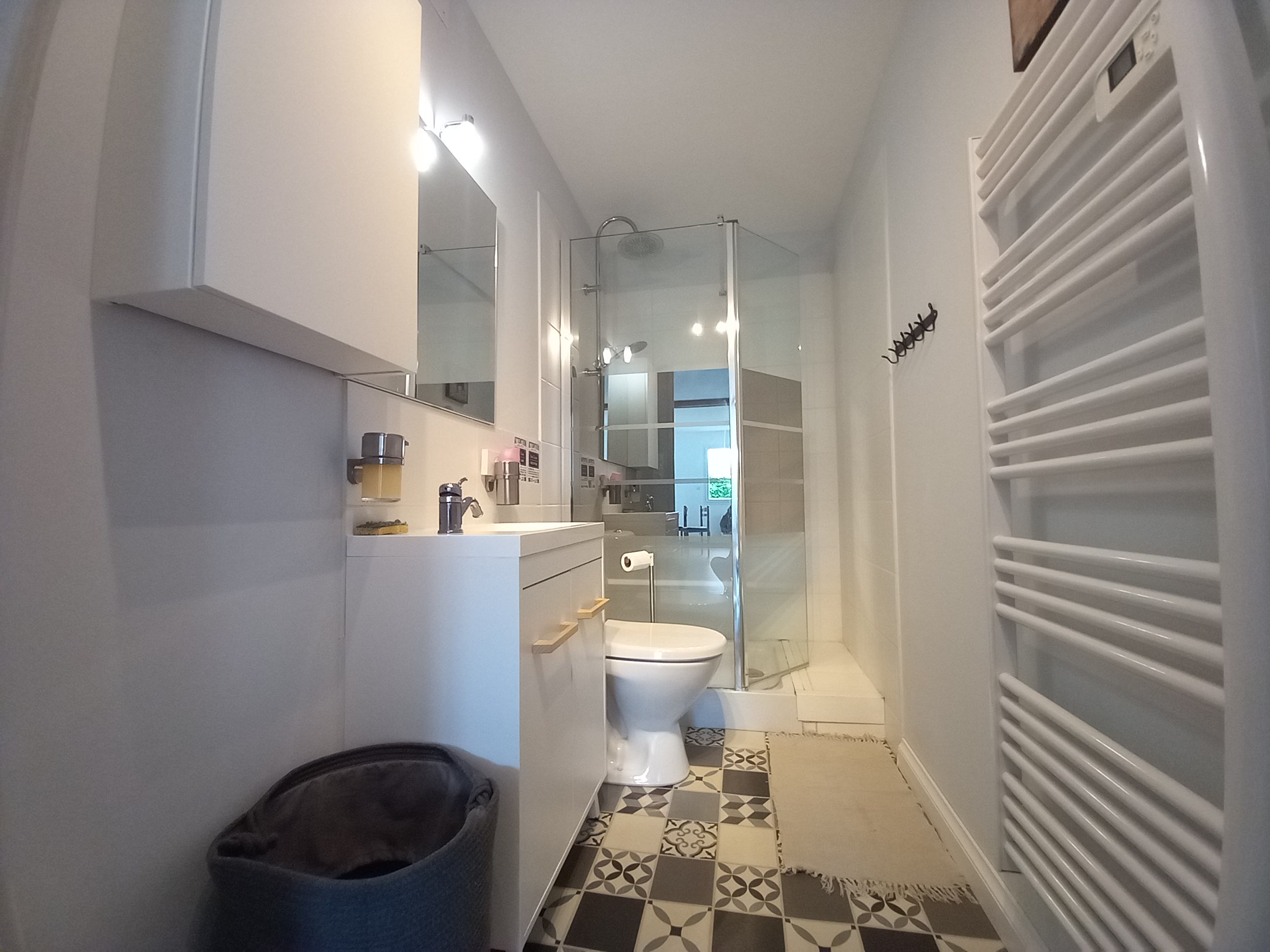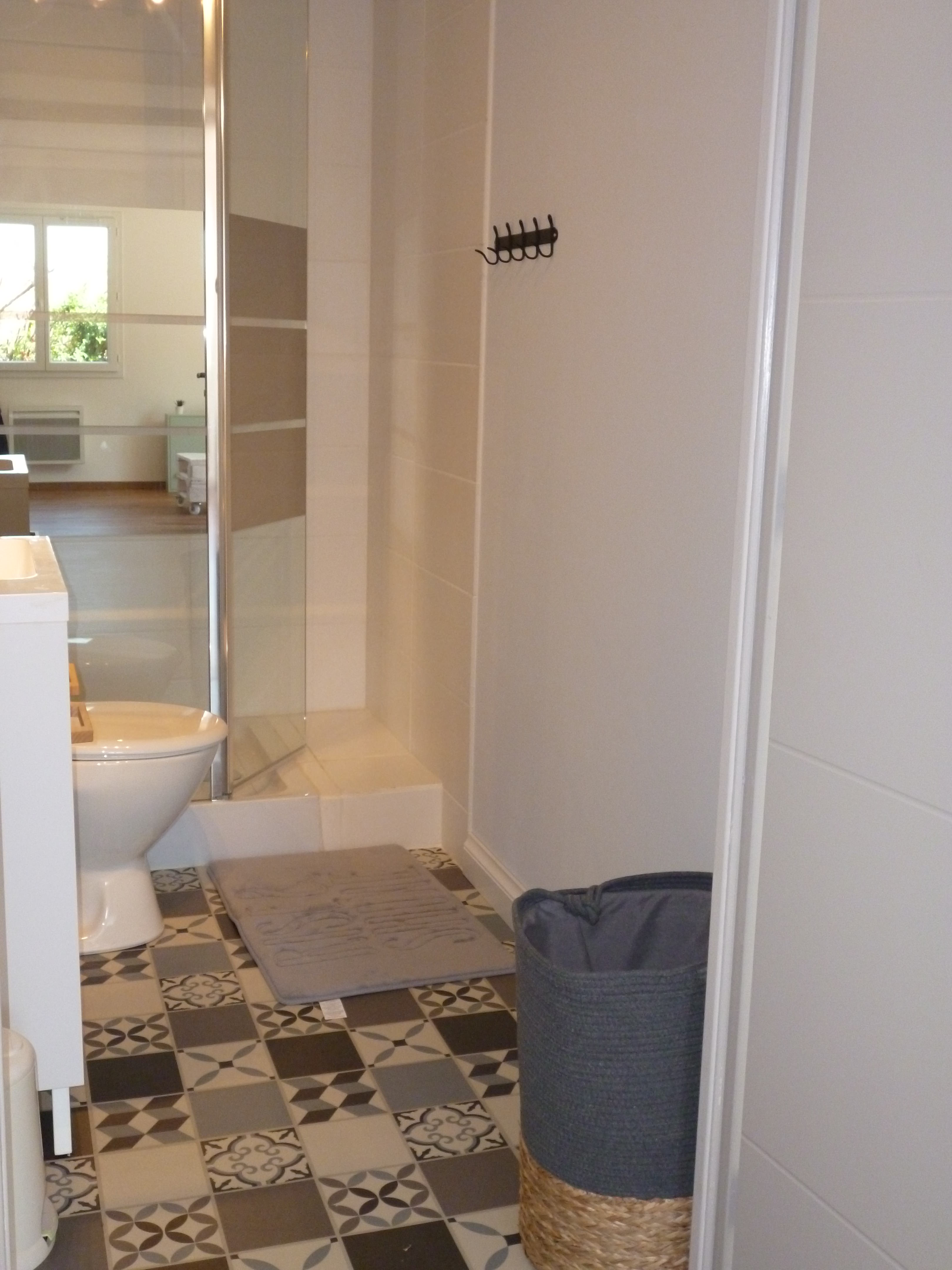 Il se compose de 2 chambres, dont une avec un lit double (140) et une avec 2 lits de 90 modulables. Un canapé convertible dans le salon peut accueillir 2 personnes supplémentaires. La salle d’eau est équipée d’une douche à double jets, d’un WC et d’un lavabo.
