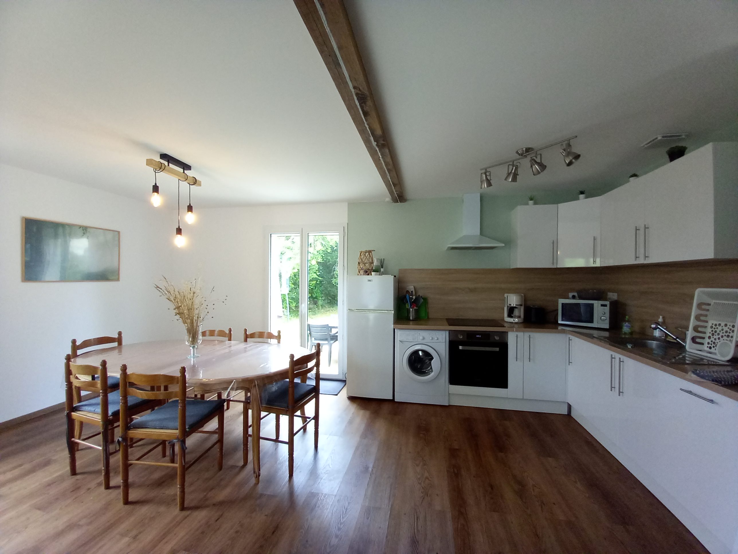 La cuisine spacieuse est toute équipée pour préparer vos repas avec une grande table à manger pour des moments conviviaux.