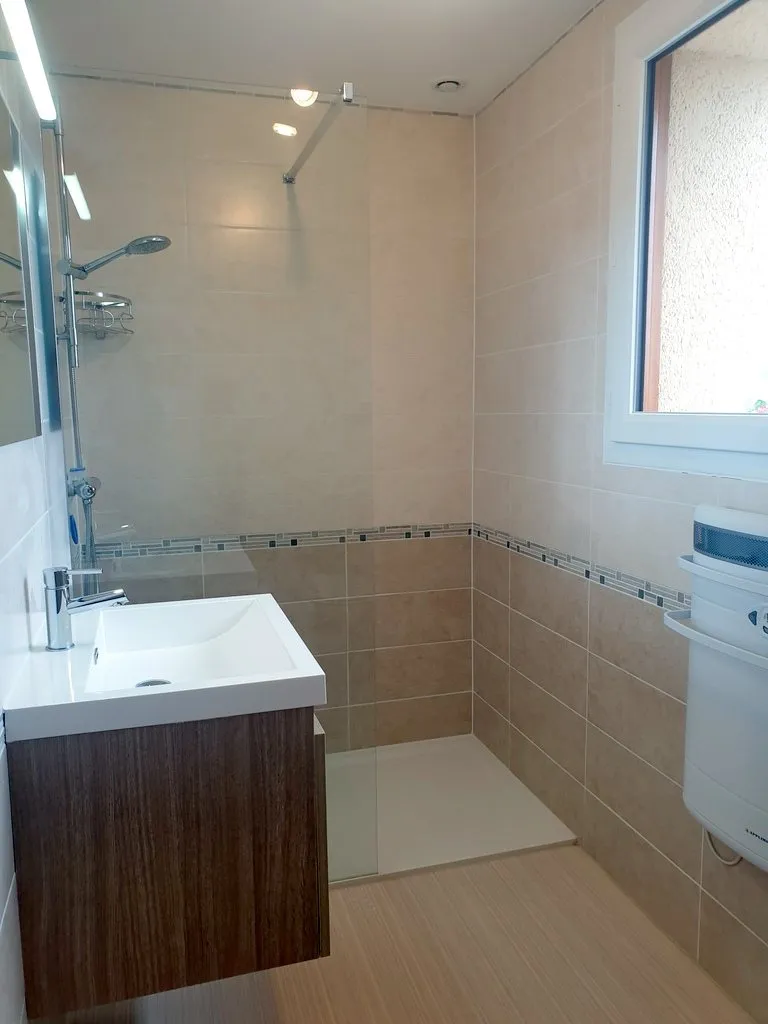 – Salle d’eau avec une douche à l’italienne et un meuble vasque. Les wc sont non séparés.