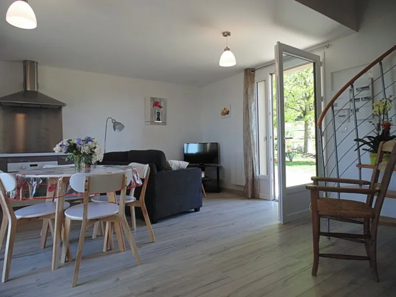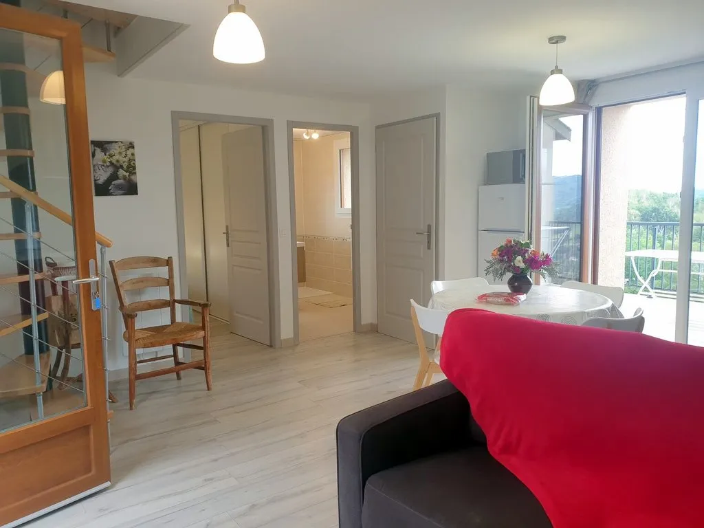 – Séjour (canapé, petit bureau, télévision écran plat, wifi) ouvert sur une cuisine entièrement équipée (plaques inductions, micro-ondes, four, lave-vaisselle, cafetière filtre et Senseo, bouilloire, grille-pain….). Le séjour s’ouvre également sur une terrasse en bois dominant la vallée où sont installés transats et salon de jardin.