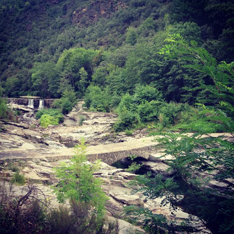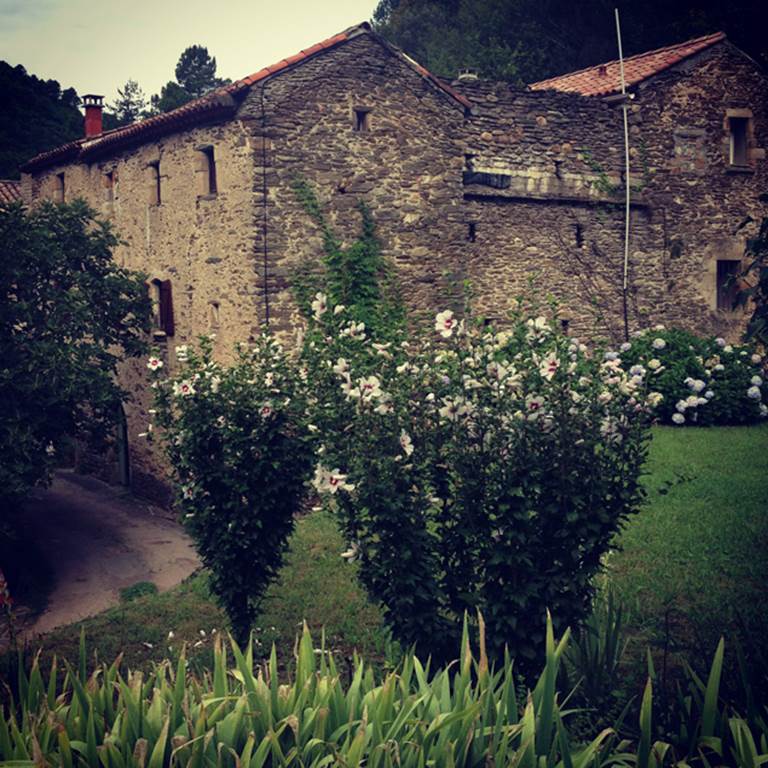 Vieille bâtisse de hameau cévenol accroché au flanc de montagne au bord du Luech, rivière qui coule entre les rochers, en cascade.