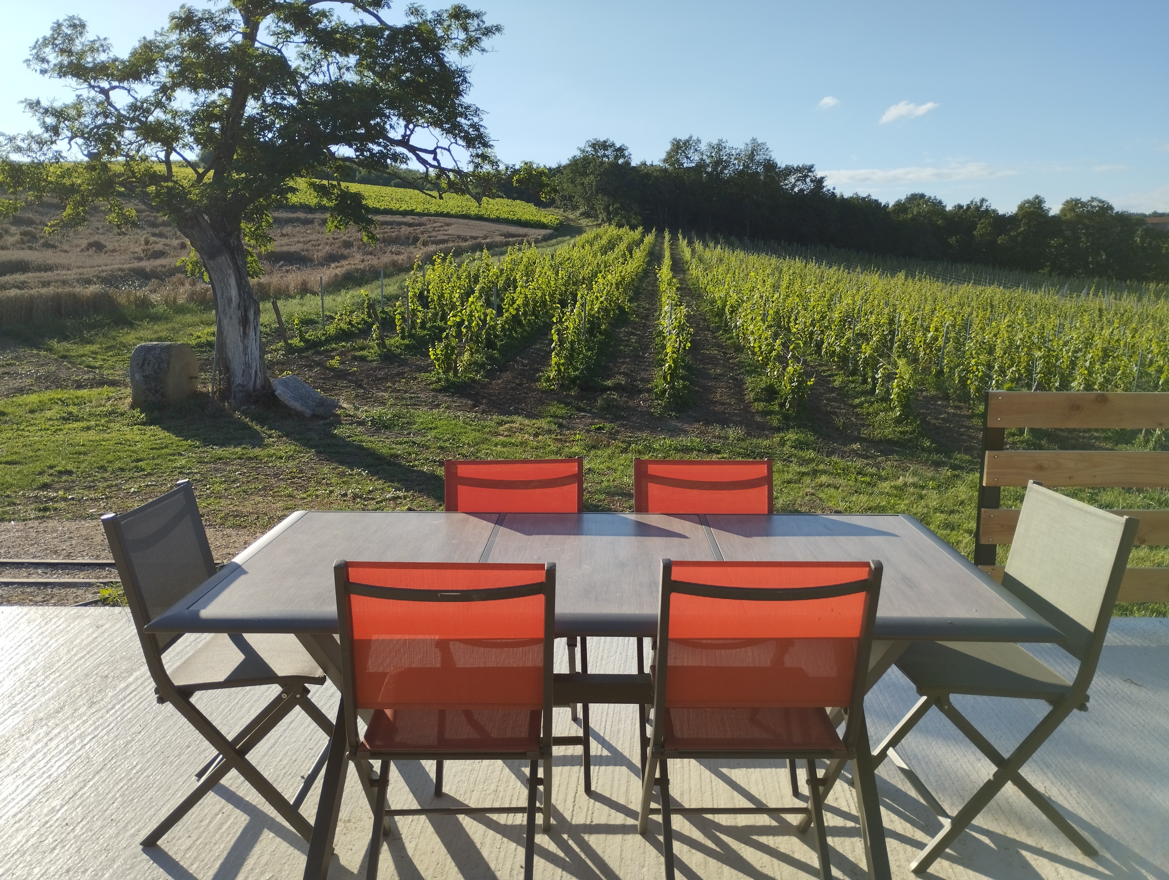 Le gîte est très lumineux ; la terrasse offre une vue sans vis à vis sur nos vignes et champs.