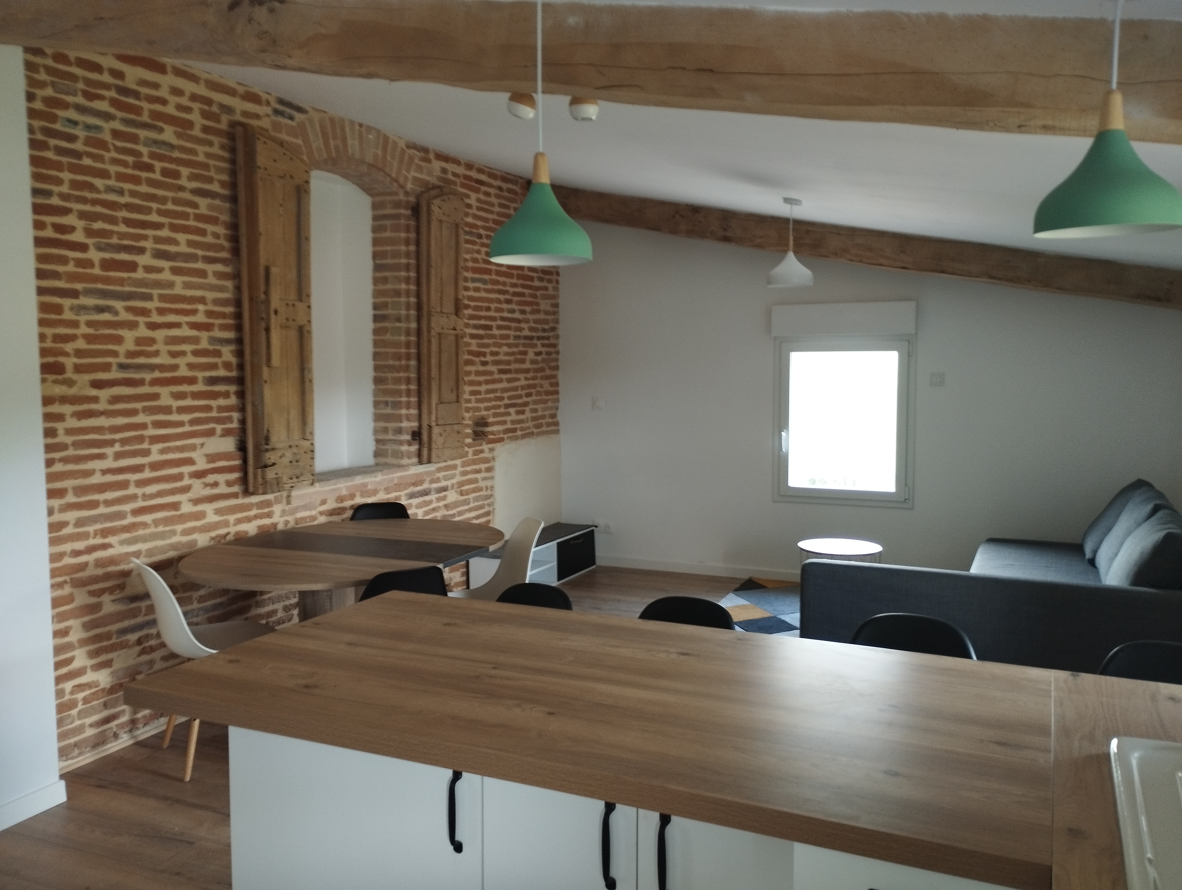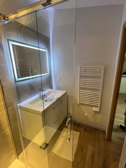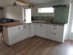 Il dispose d’une cuisine dotée d’un bar, ouverte sur le salon. La cuisine est fonctionnelle et bien équipée : frigo, congélateur, four, micro-onde, plaque induction, cafetière et machine Expresso (Tassimo), bouilloire et grille pain.
