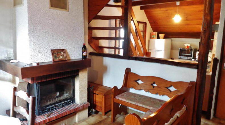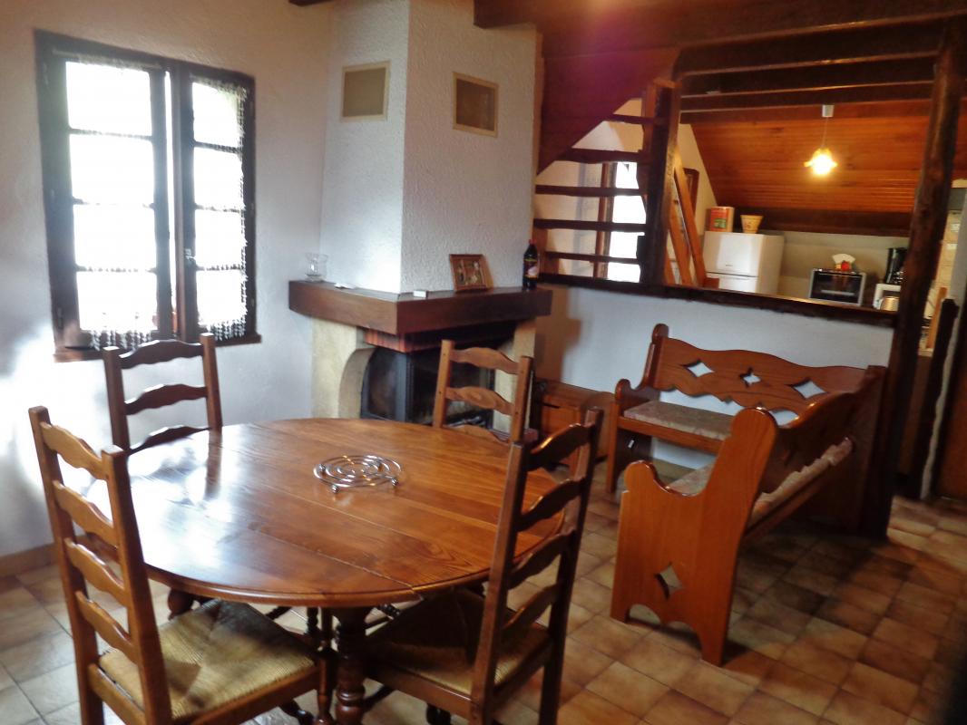 Sur 2 niveaux : 2 Chambres dont une sous combles (2 lits 1 pl., 1 lit 2 pl.), salle à manger/coin-salon/coin-cuisine, lave linge , salle de bains, WC indépendant, cheminée insert en fonction, terrasse et entrée communes, terrain non clos. Chauffage électrique et bois. Charges en sus. Accés au gîte par escalier. .