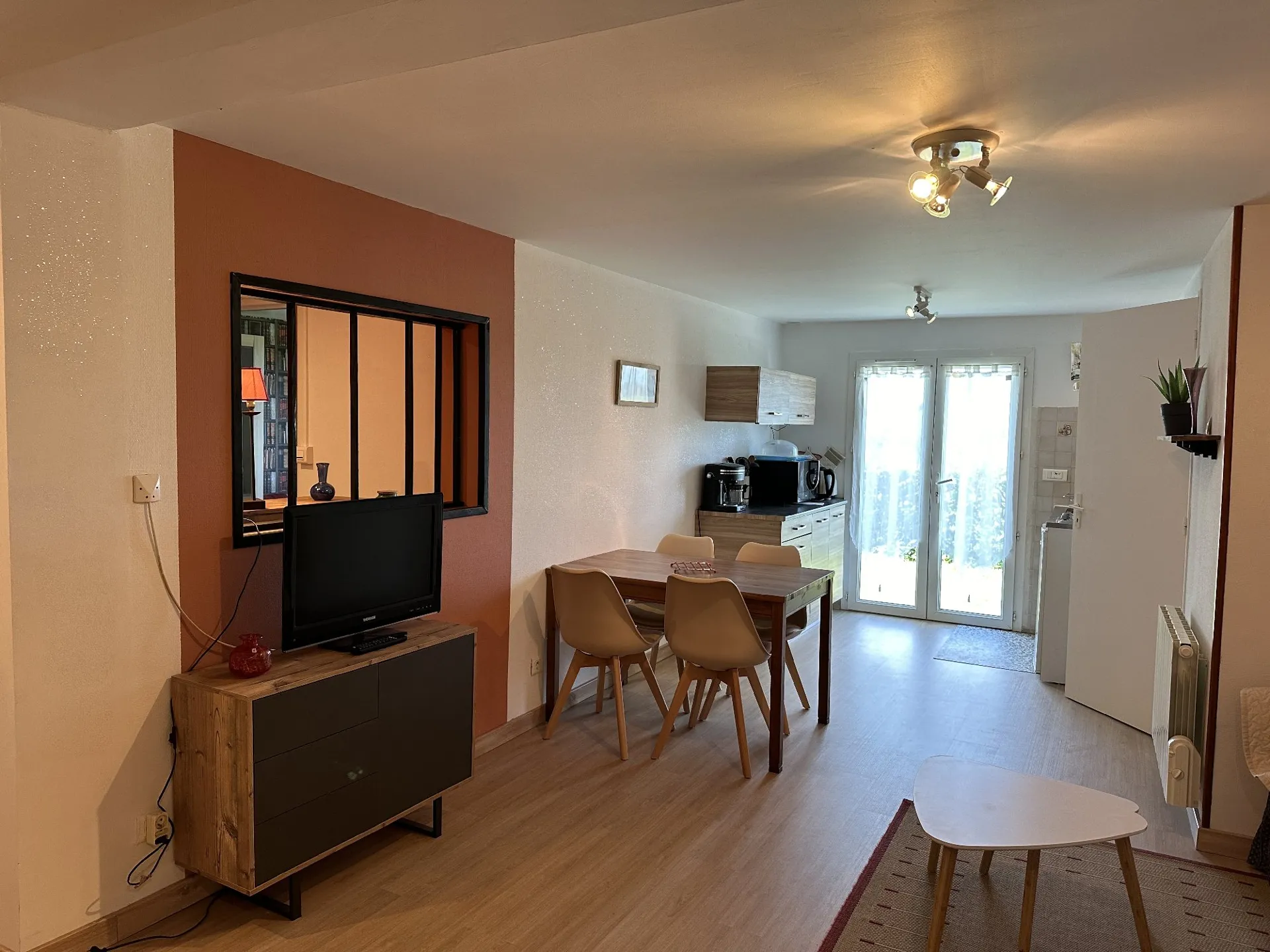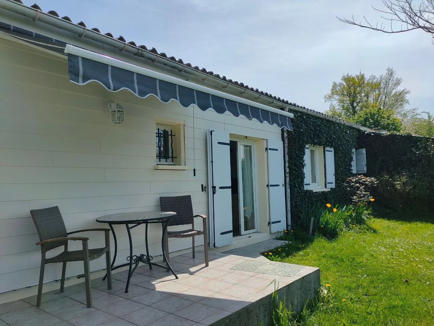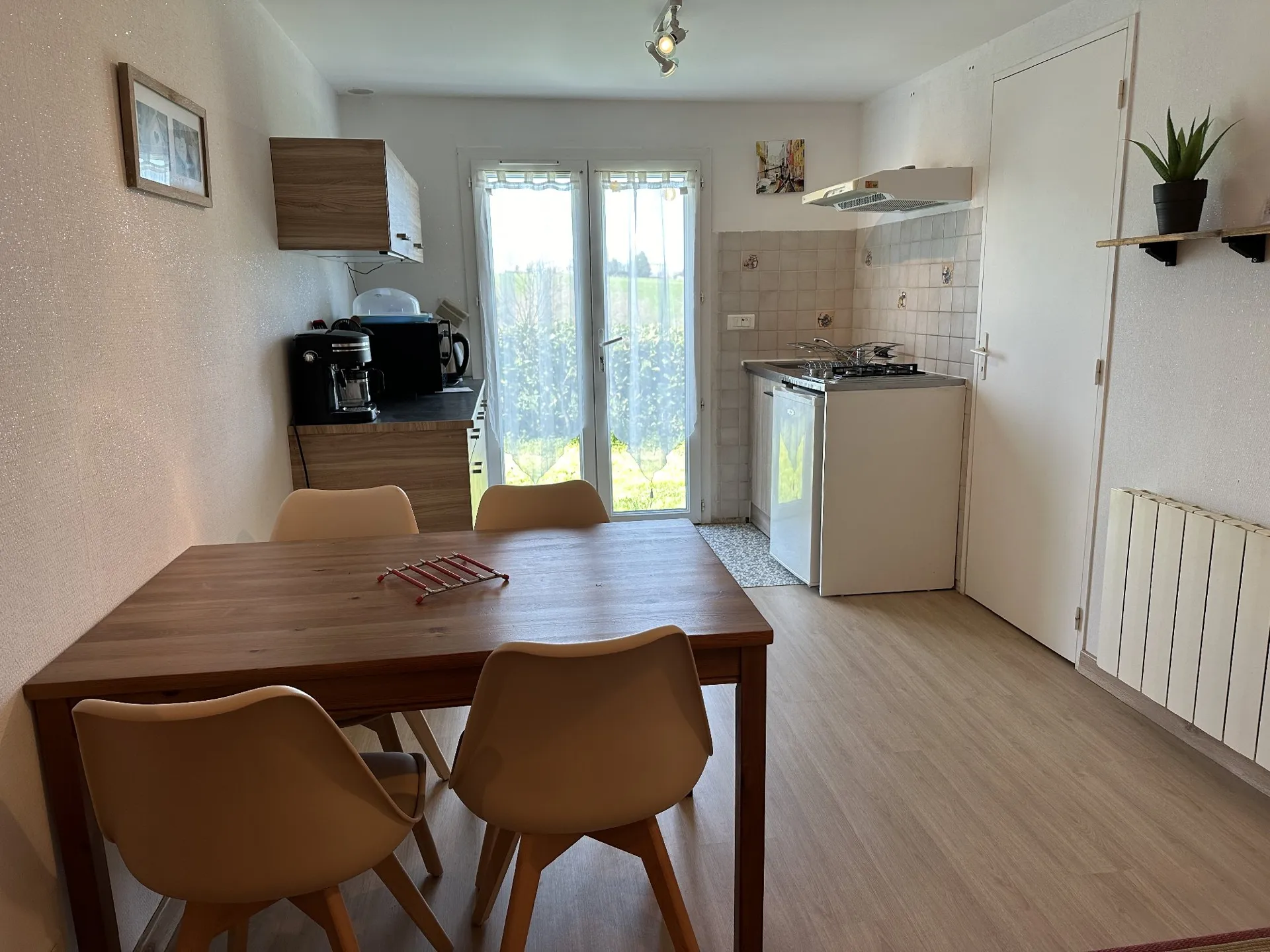 Cette location de vacances mitoyenne à la maison de la propriétaire possède sa propre entrée indépendante. Elle est implantée sur un terrain clos et possède une terrasse. La cuisine équipée d’une plaque de cuisson au gaz, d’un mini-four, d’un congélateur et d’un micro-ondes est ouverte sur le séjour (canapé convertible en 120 et télévision). La chambre de 13 m² est meublée avec un lit en 140 (literie neuve mars 2019). Lave-linge privatif. A l’extérieur : salon de jardin et barbecue avec store.