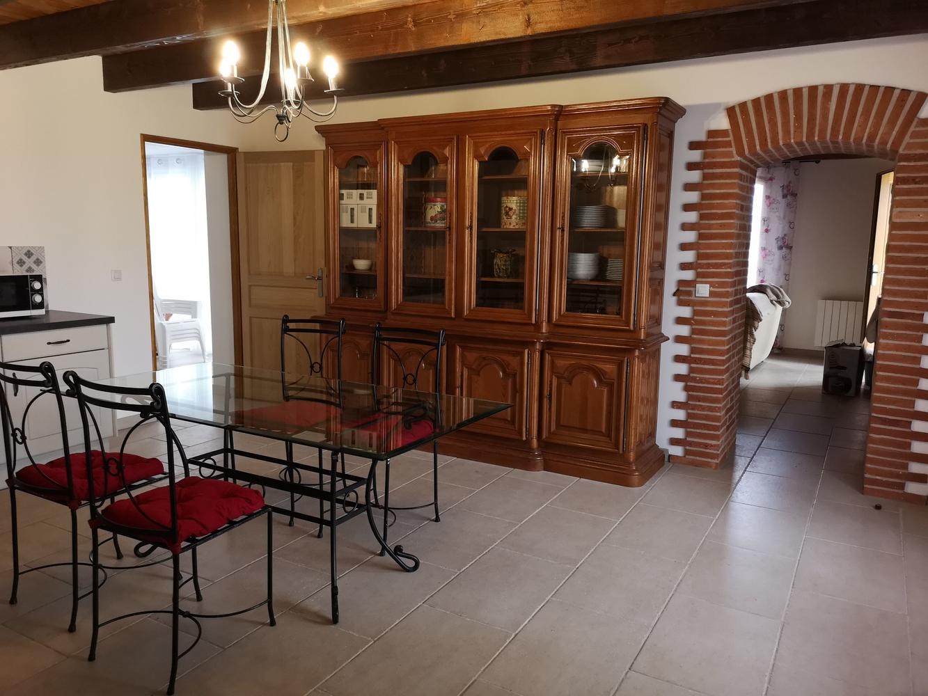 La cuisine équipée, spacieuse donne sur une grande terrasse privative couverte avec bain de soleil, un salon de jardin en bois où vous pourrez prendre un repas à l’abri du soleil.