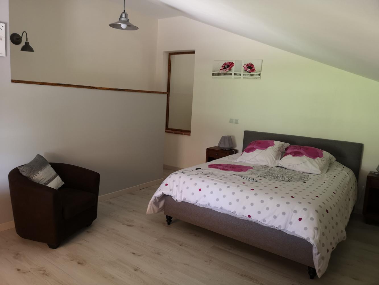 A l’étage, une chambre mansardée avec grand placard, commode et fauteuil vous permet d’admirer la campagne.