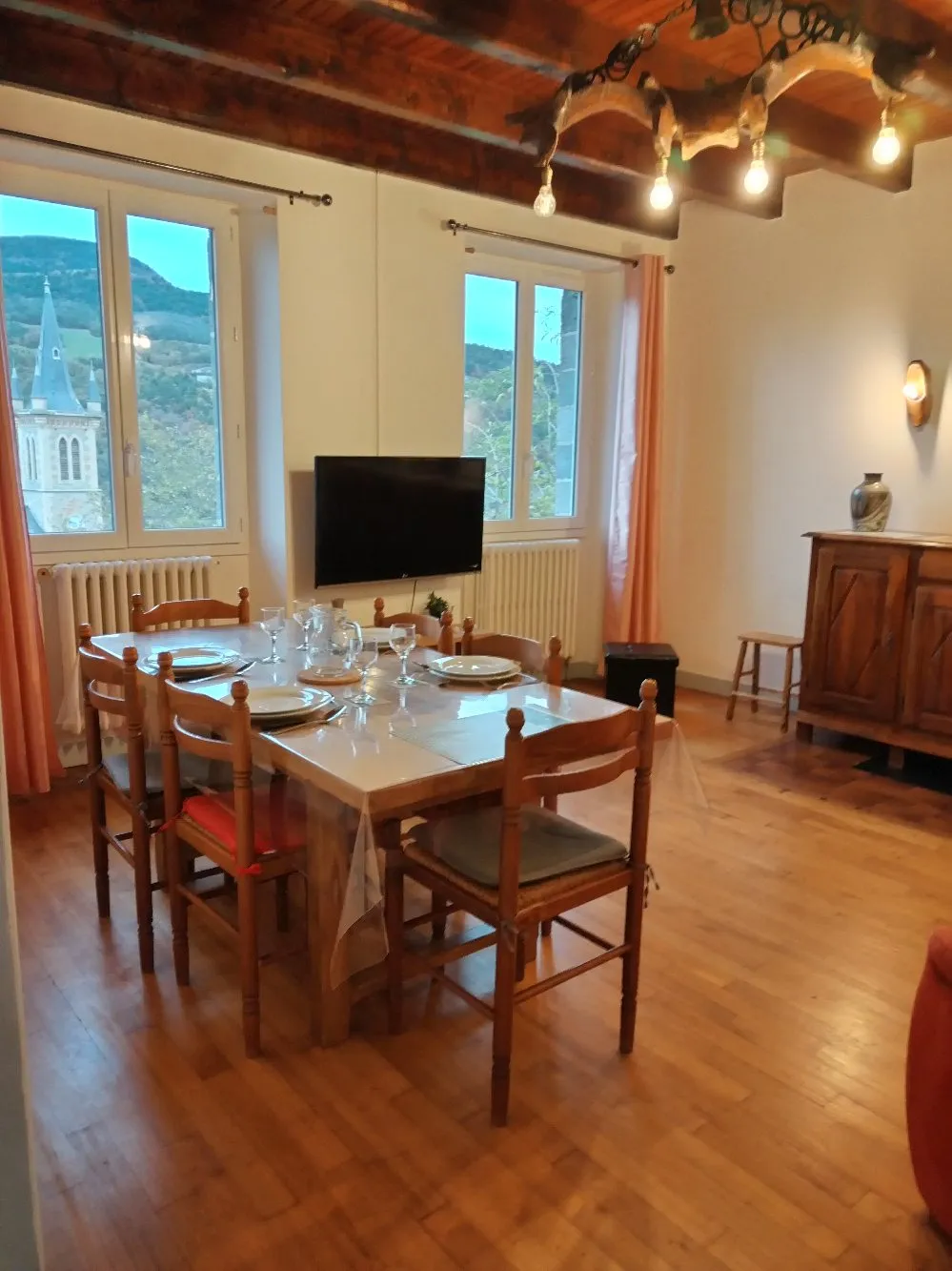 Salon : table et chaises pour 6 personnes , canapé, TV pas de wifi le téléphone passe bien