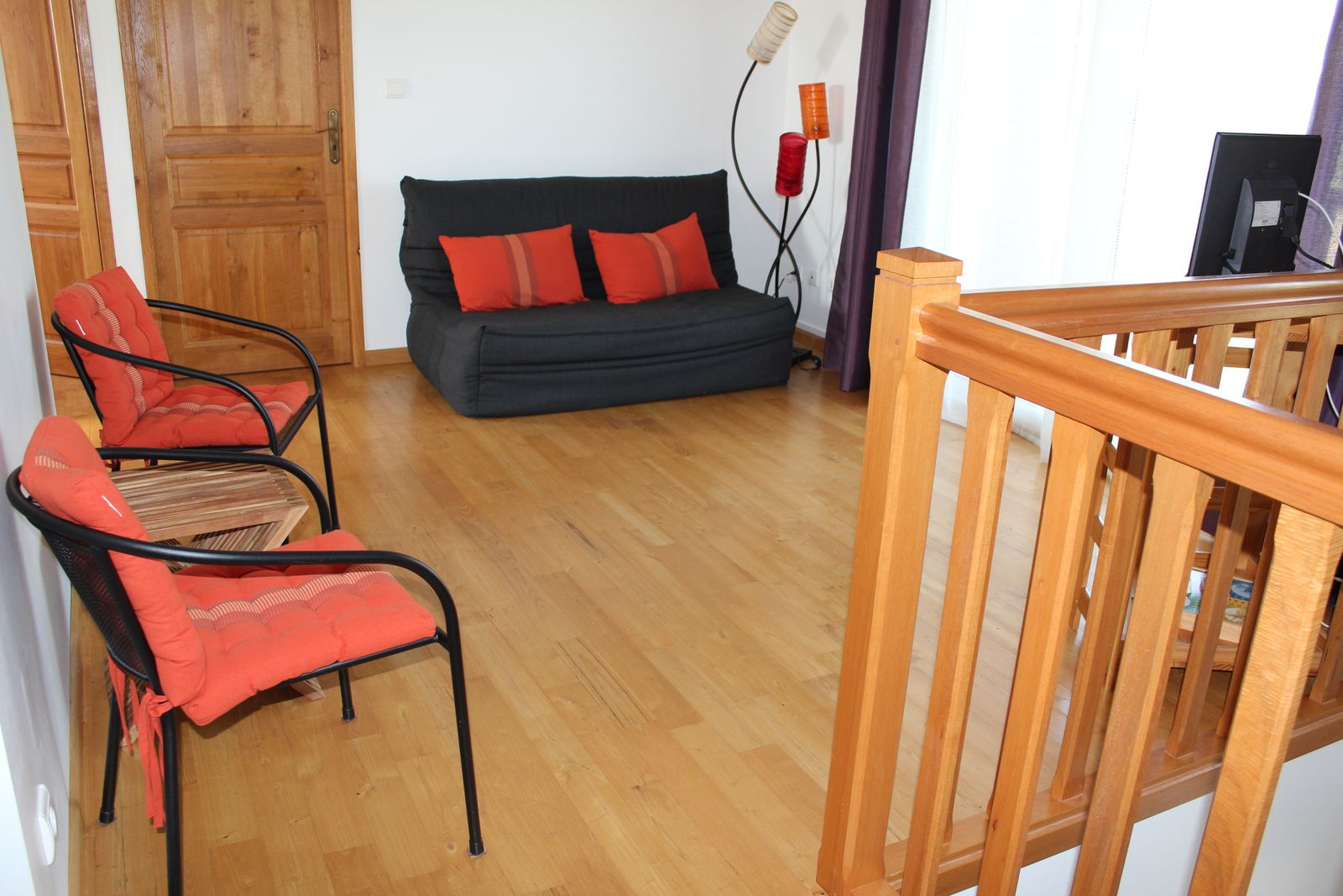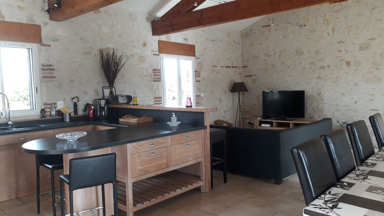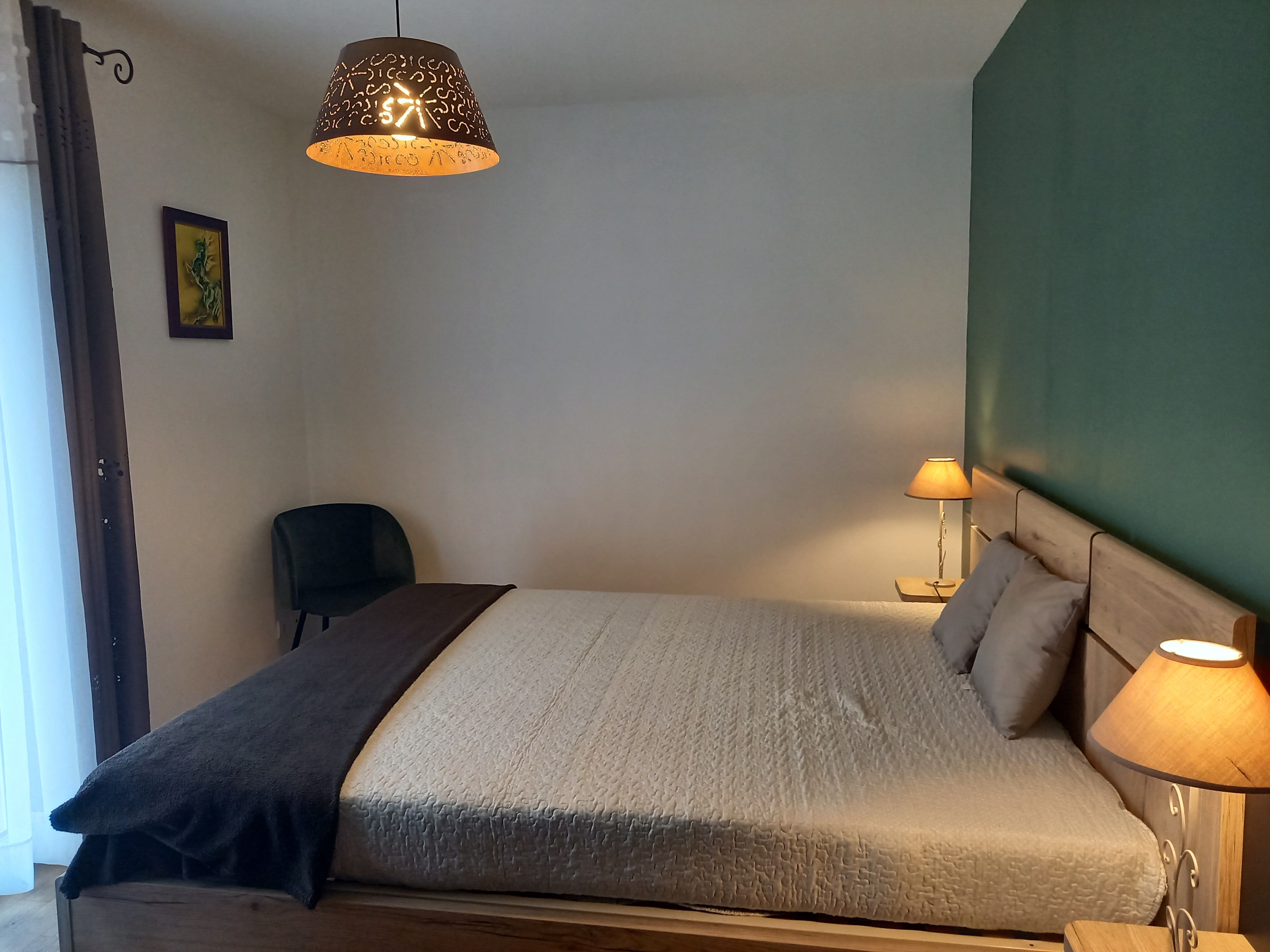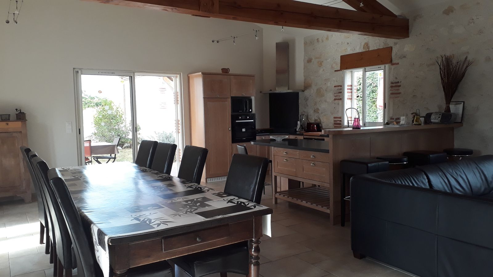 Gite indépendant, au rez-de-chaussée : cuisine intégrée (MO, LV), salon (canapé, TV, lecteur DVD, radio CD), wc, salle d’eau, 1 ch (1×160), 1 ch (1×140), cellier (LL). A l’étage : salon (fauteuil, TV), salle de bains, wc, 1 ch (1×160) avec balcon, 1 ch (2×90). Terrain privé non clos (2000 m2). Terrasse couverte (20 m2). Barbecue. Equipement bébé sur dde (chaise haute, lit bébé). Chauffage au sol élec. Le prix comprend : la fourniture des draps, linge de maison, l’accès internet. En option : linge de toilette, ménage. Nouveauté 2025 : chambres climatisées.