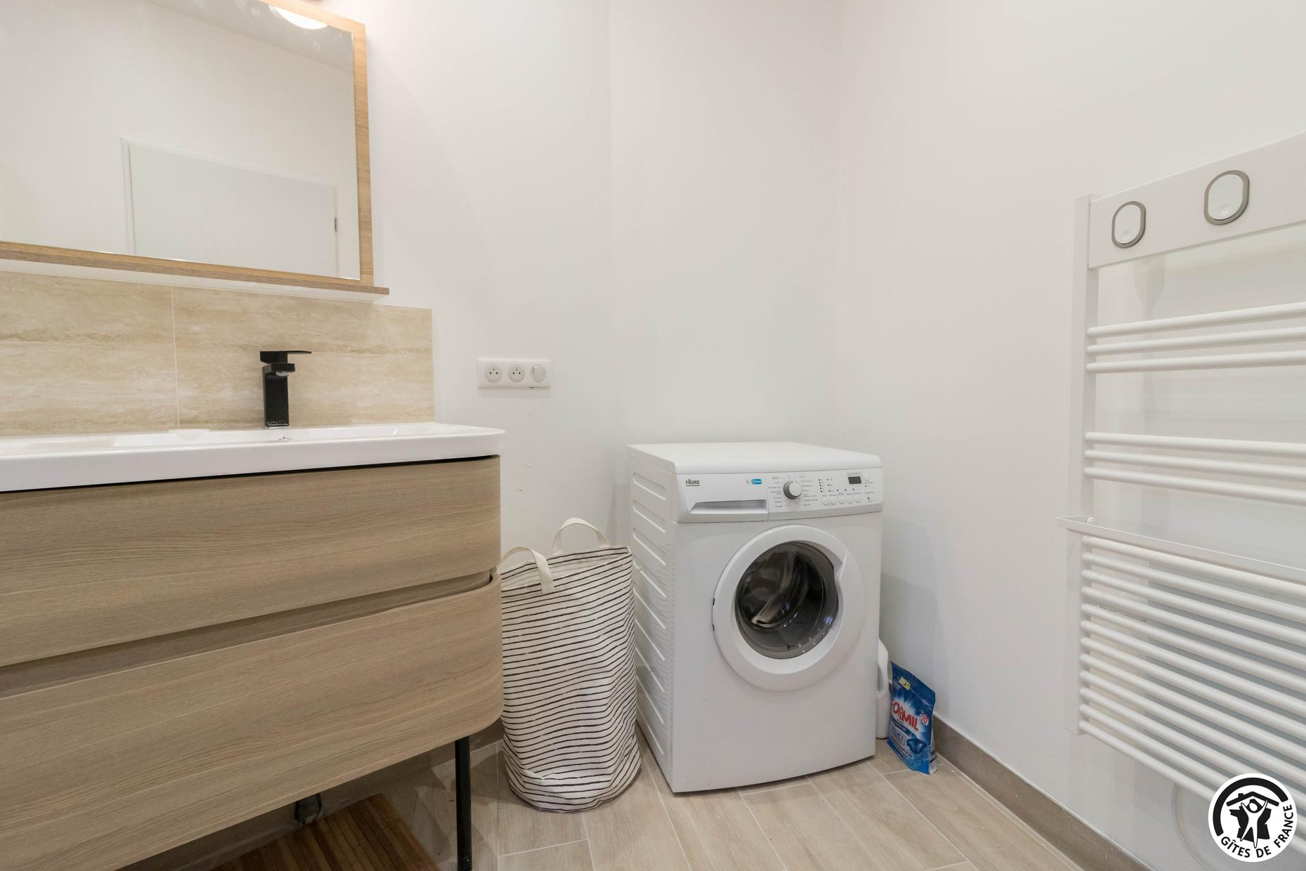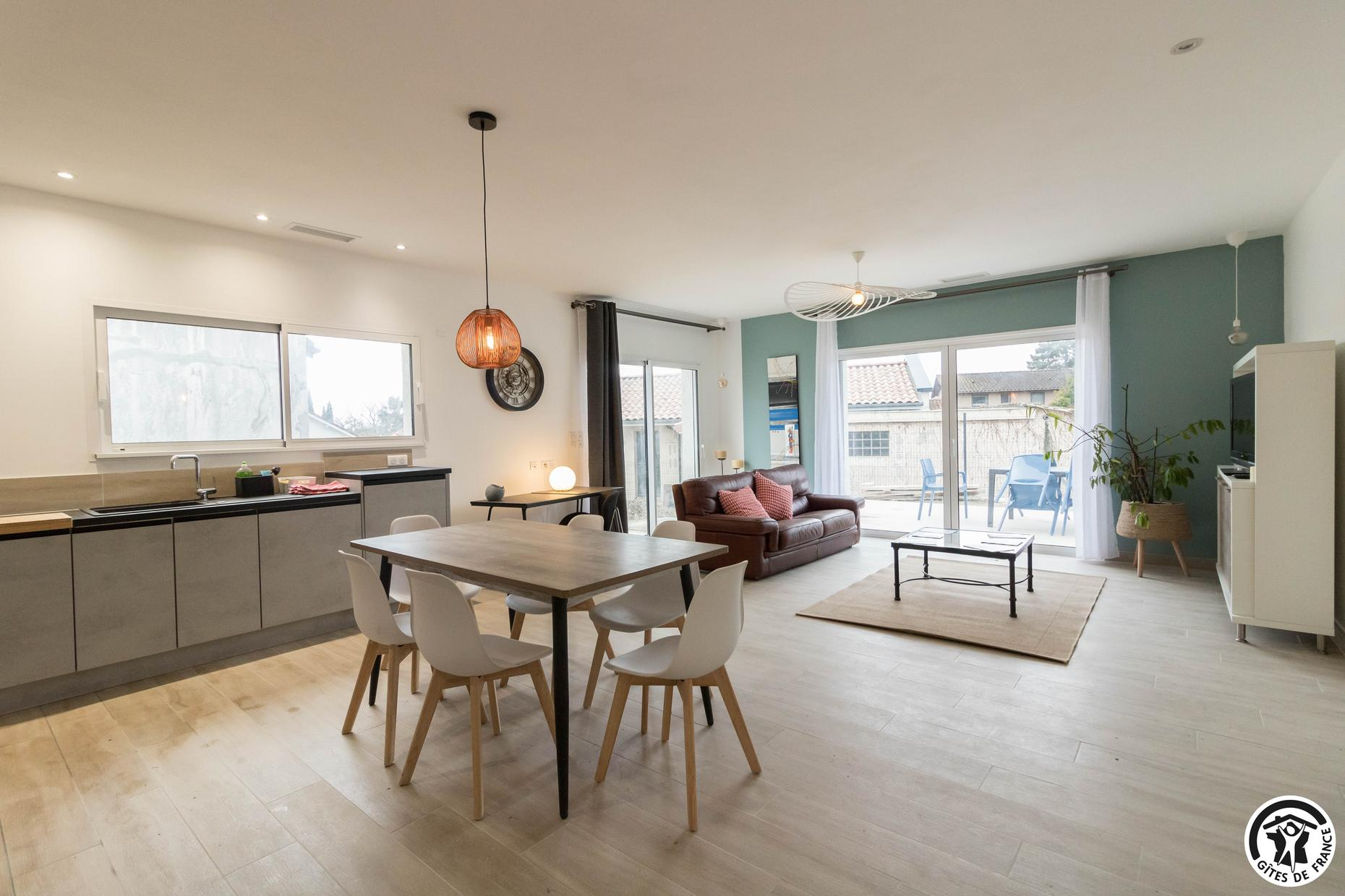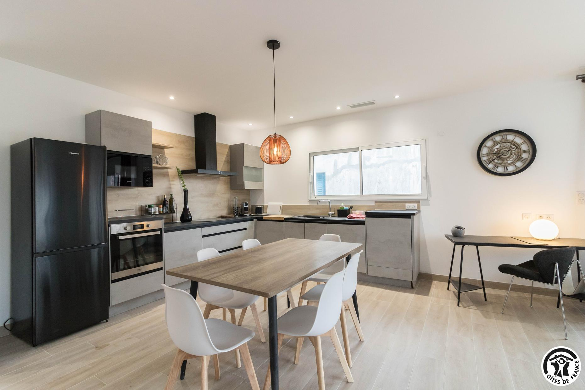 Gîte de plain-pied (dans une impasse, avec un voisinage calme) climatisé, accessible après une marche : entrée, séjour composé d’un coin cuisine, d’un espace repas et d’un salon, 2 chambres avec chacune 2 lits simples en 90*190cm, jumelables en 2 lits doubles en 180*190cm, salle d’eau (douche et vasque)et WC indépendant. Terrain clos avec aire de stationnement (partagé avec l’autre gîte) pour une voiture, et un jardin avec terrasse. Lit bébé sur demande