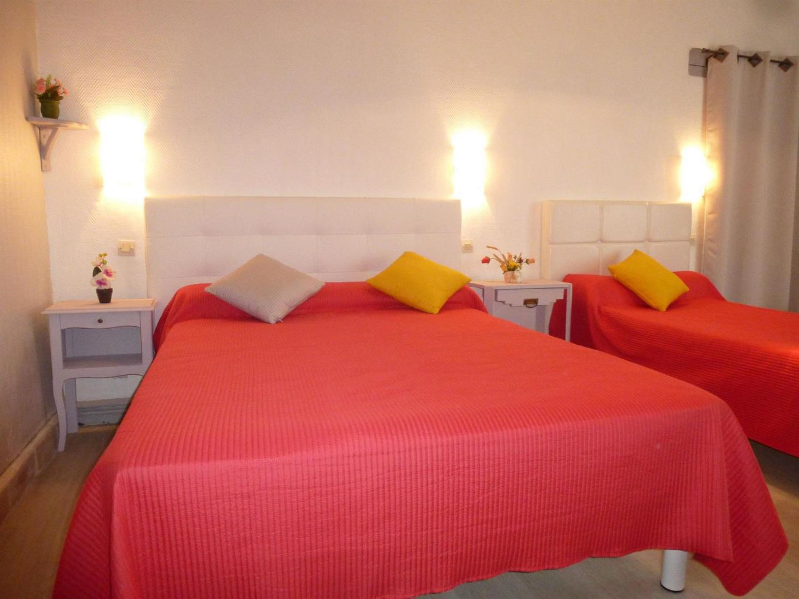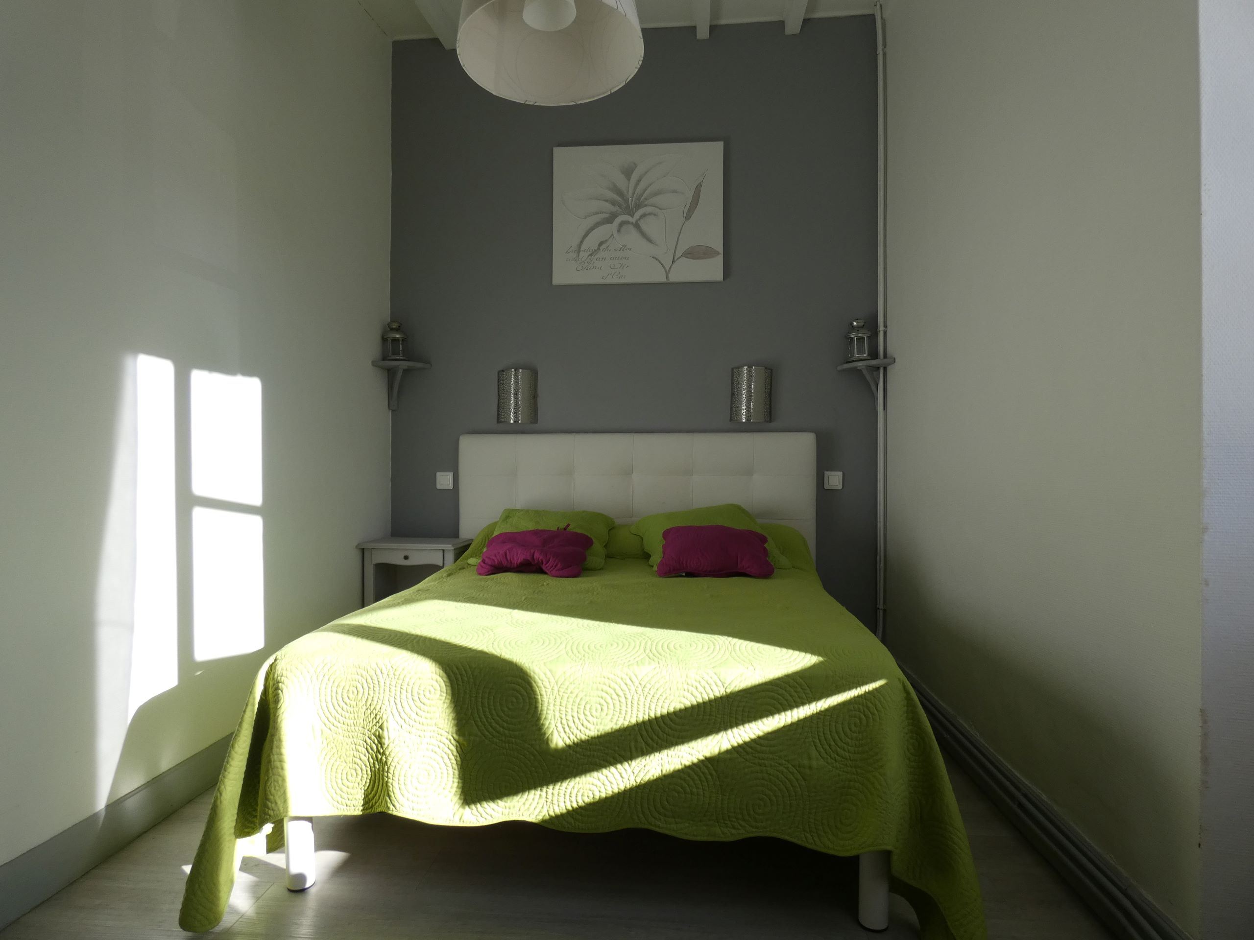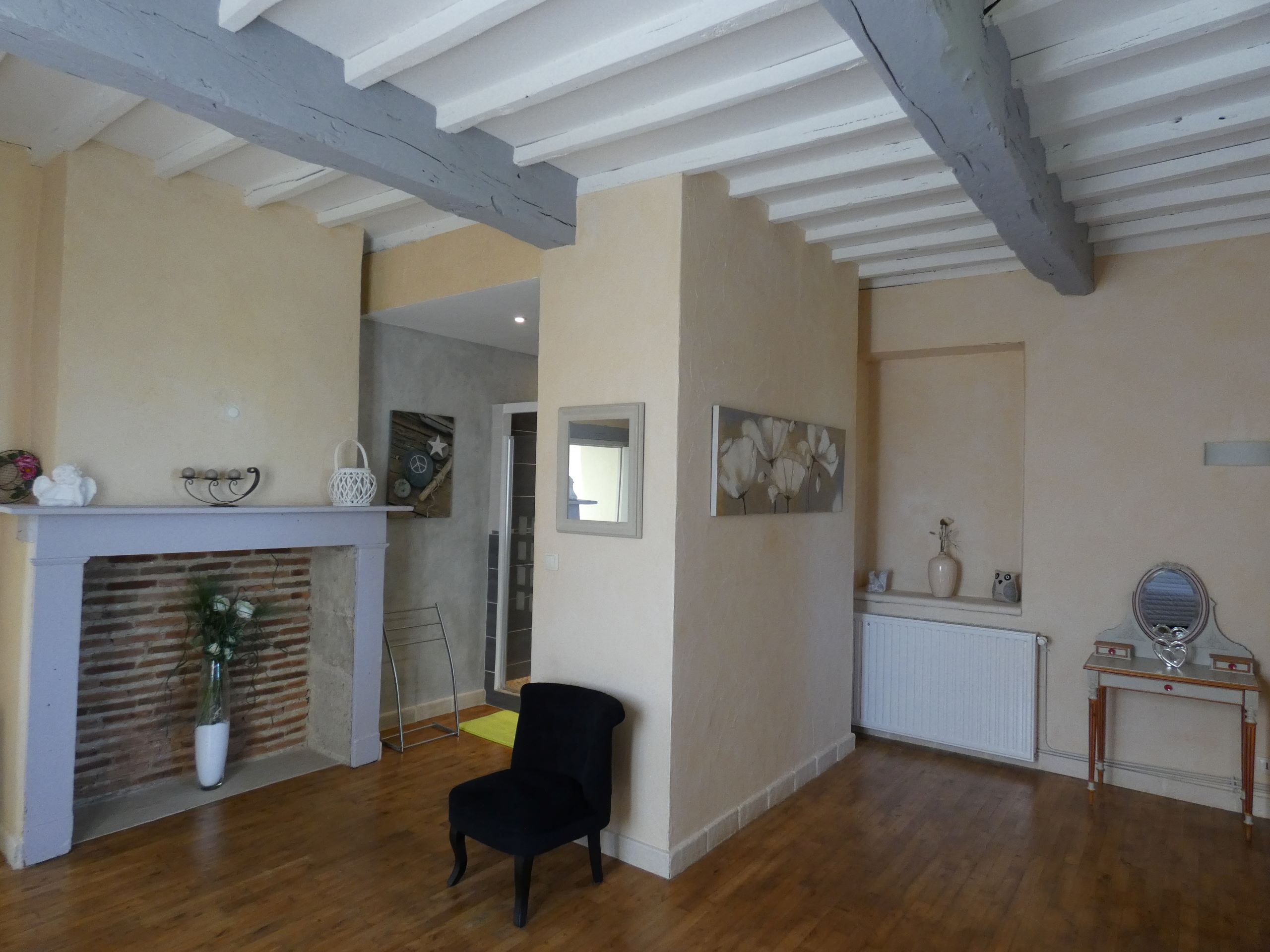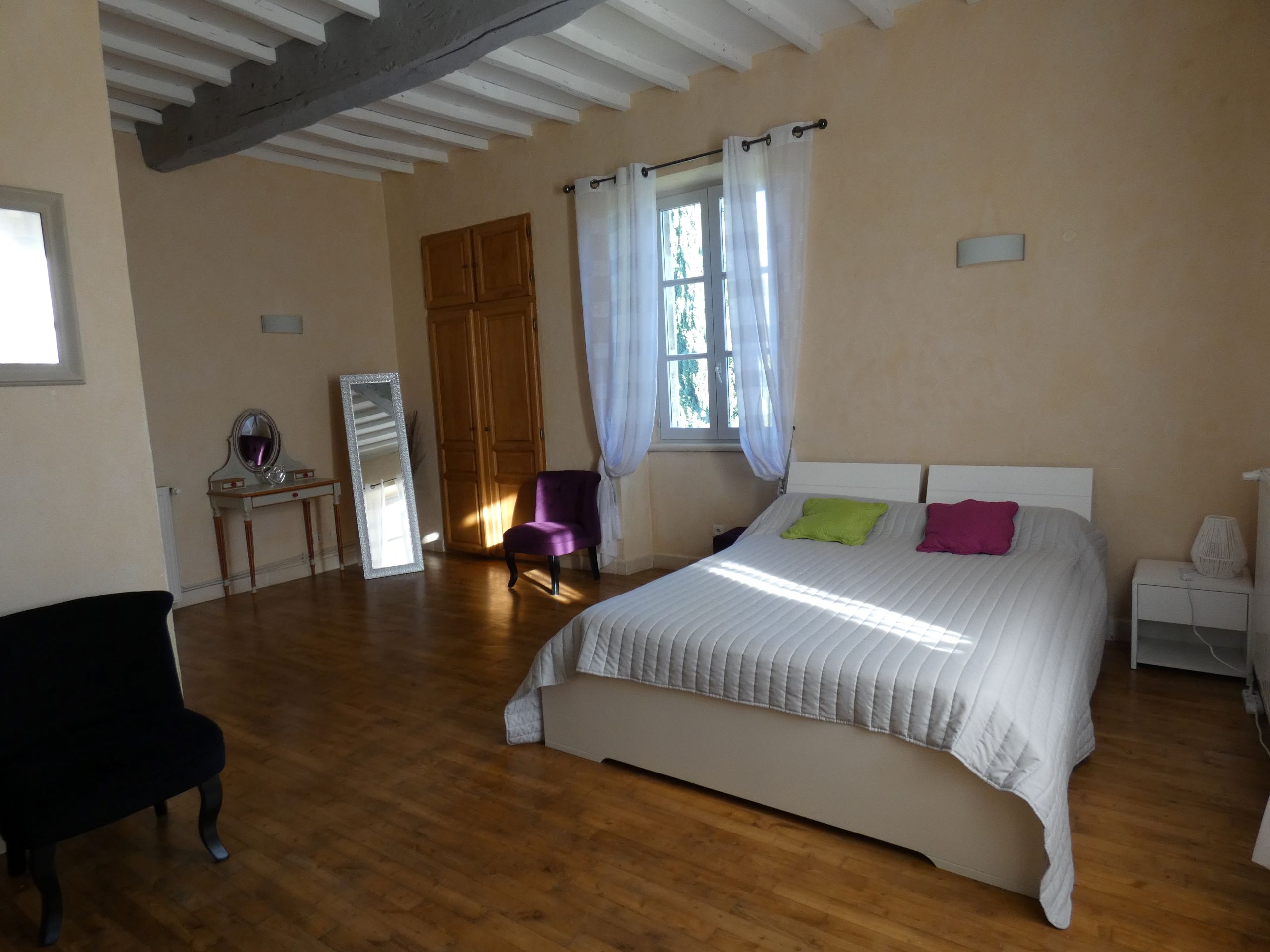Dans votre location, vous disposez d’une chambre double (lit double) et d’une chambre familiale (1 lit double + 1 simple). La chambre de l’étage (suite parentale avec salle d’eau privée) peut-être mise à disposition sur demande et en supplément.