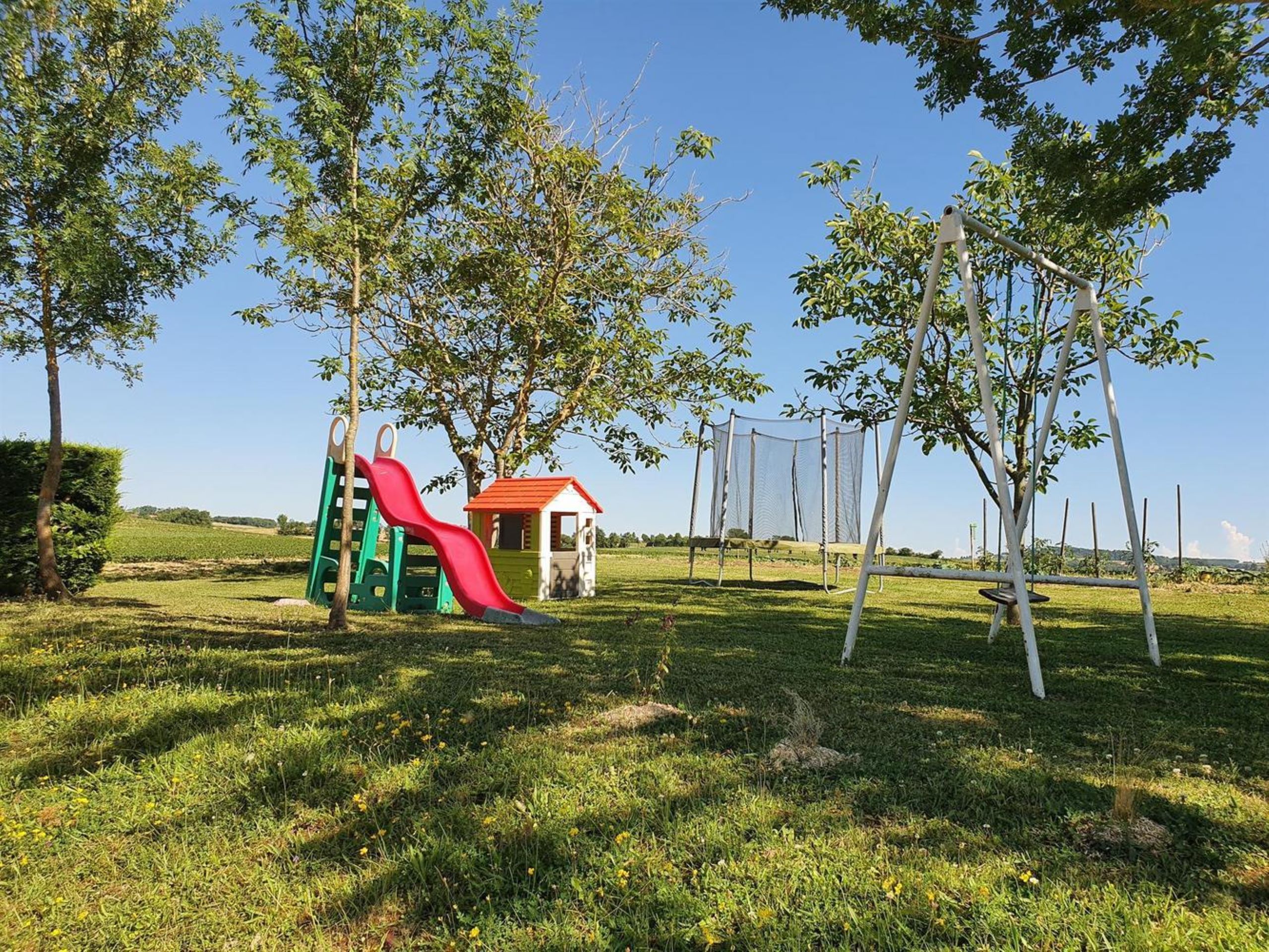La terrasse donne sur le parc et ses jeux extérieurs (trampoline, balançoire, boulodrome…)