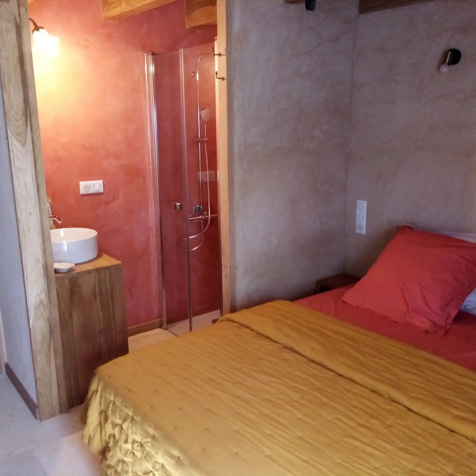 • La chambre de la Huppe au rez de chaussée : 1 lit 160, avec un espace douche et lavabo, une commode