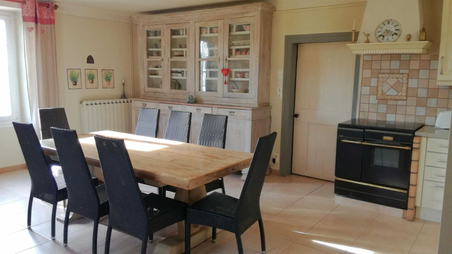 Au rez-de-chaussée, une grande cuisine de 30m² toute équipée avec grande table et chaises (équipement électroménager complet, avec même un Mr Cuisine édition plus !), une buanderie, un wc et un grand salon (canapé convertible, tv, jeux de société ).