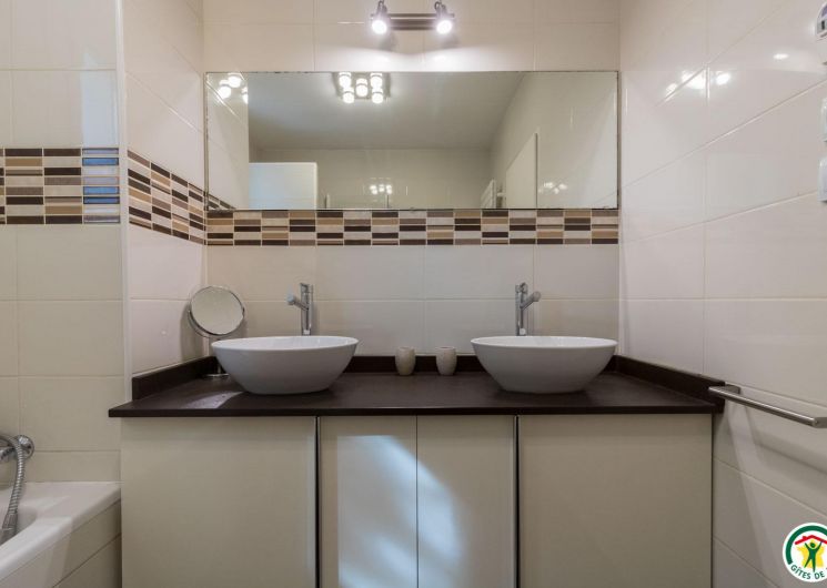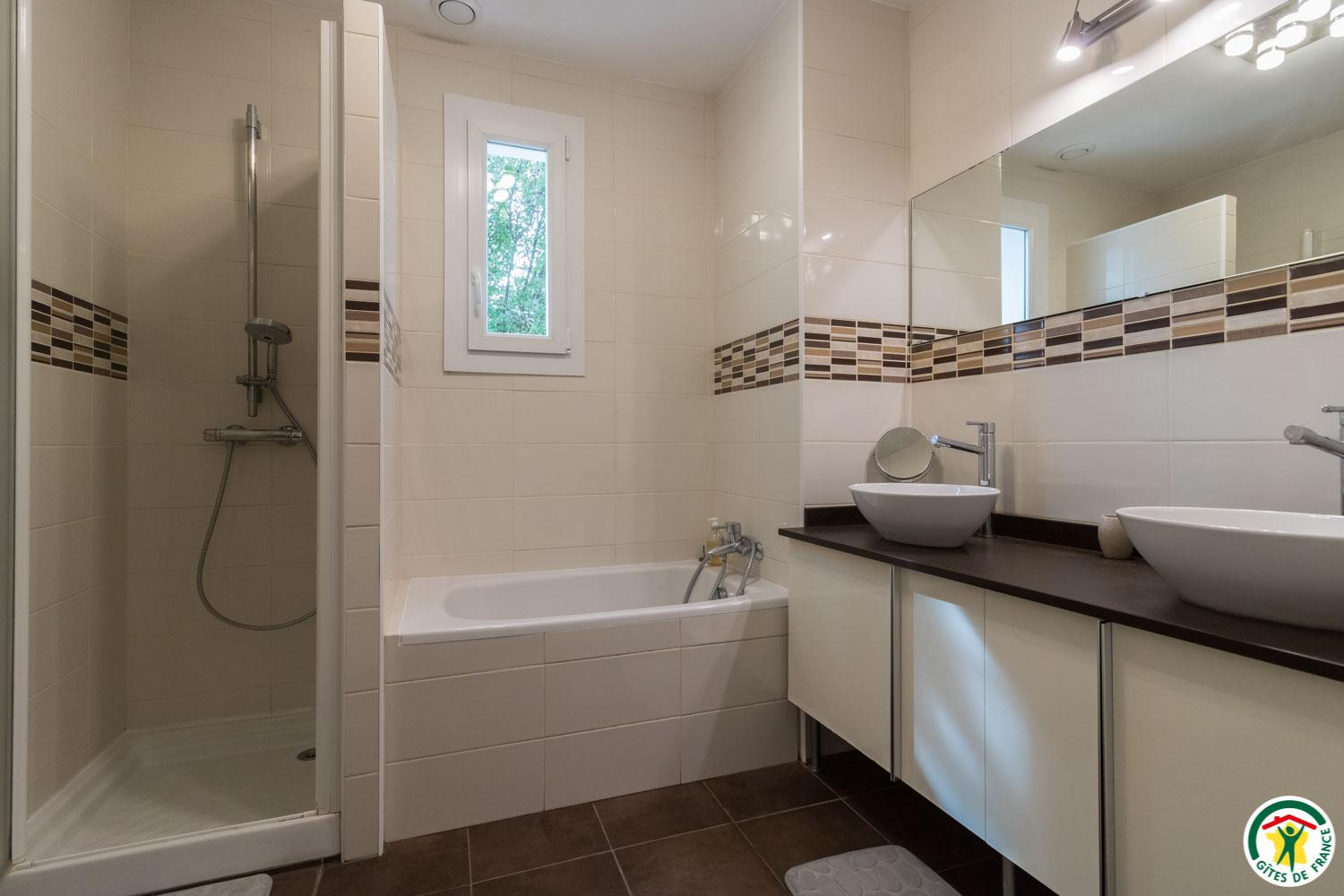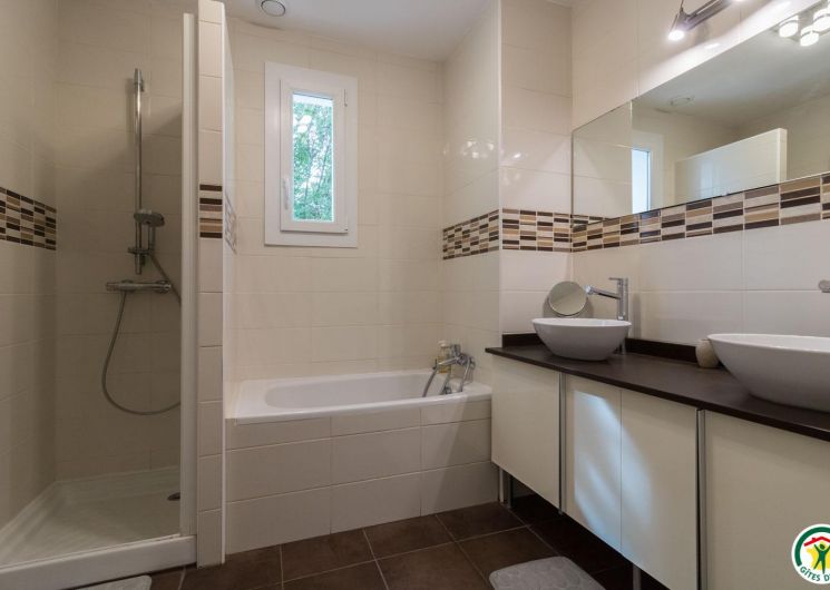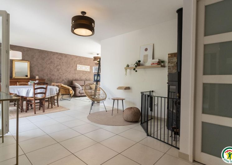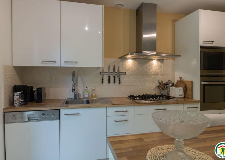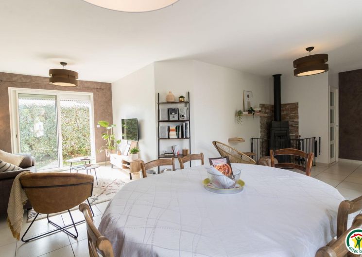 Gîte de plain-pied de 110m2 avec un grand séjour composé d’une grande table pour manger et d’un coin salon (TV, radio CD, canapé et fauteuils). Une cuisine intégrée est indépendante avec un réfrigérateur-congélateur, 5 feux gaz, un four, un micro-ondes, une cafetière à filtres, une cafetière à dosettes. 2 chambres (1 lit pour 2 personnes en 160*200cm)(1 lit pour 2 personnes en 140*190cm), un bureau avec un canapé-convertible pour 2 personnes en 140*190cm, une salle de bains avec douche et baignoire, un WC indépendant et un garage avec lave-linge, barbecue et ustensiles de ménage, terminent de composer ce charmant gîte.