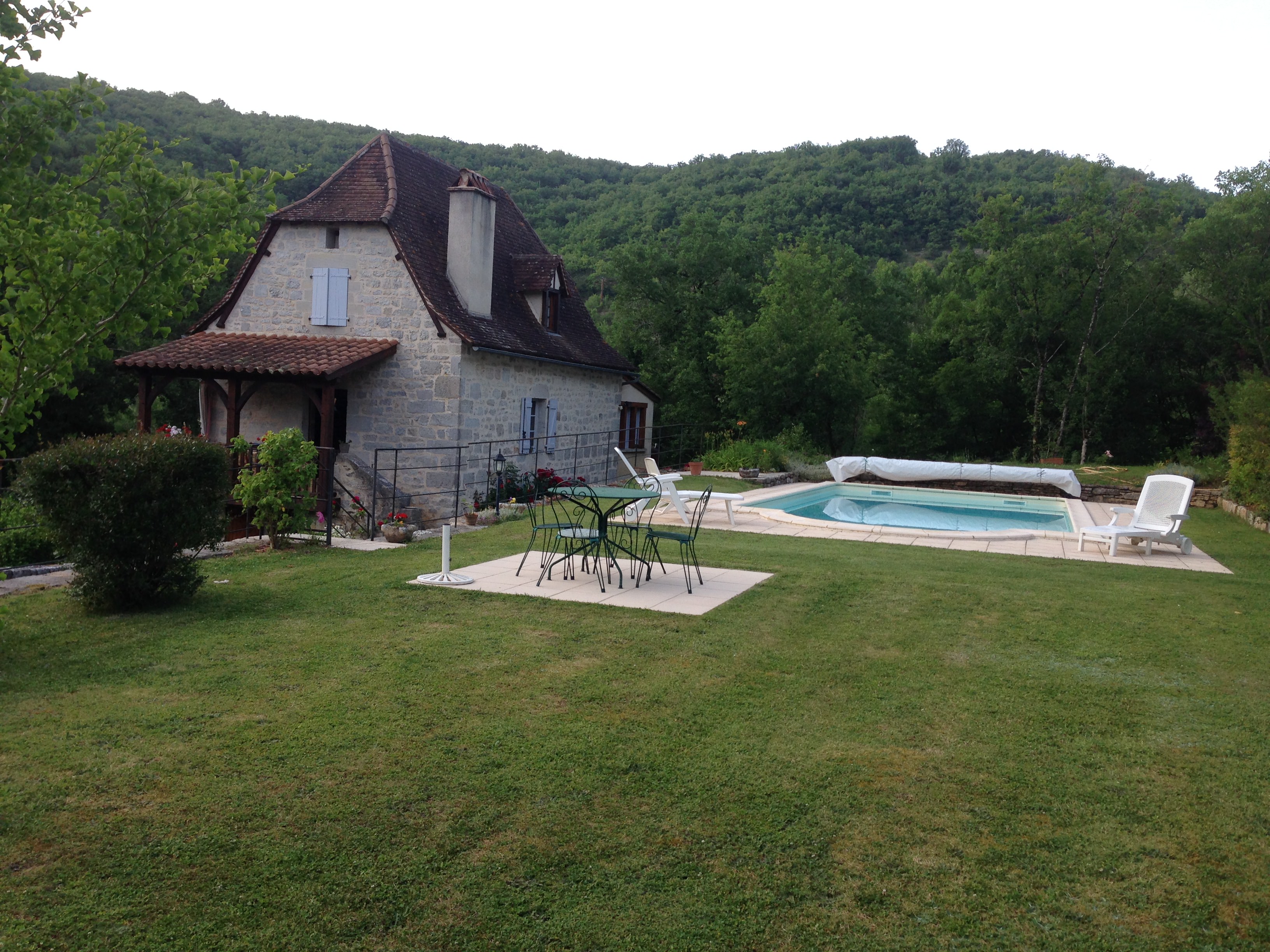 La maison sur 3 niveaux offre en RDC bas, une douche, un WC, avec coin bureau et rangement, au RDC haut une grande pièce avec sa souillarde, un ‘Cantou’ avec une cuisine ouverte en lien avec un balcon couvert ainsi qu’une pièce avec coin salon et repas donnant sur une terrasse coté Célé; à l’étage 2 chambres équipées de lit en 140 avec une Salle de bain et WC séparé. Idéal pour 4 personnes L’extérieur jouxte pour partie directement le Célé pour le reste il s’agit d’un espace isolé avec sa piscine.