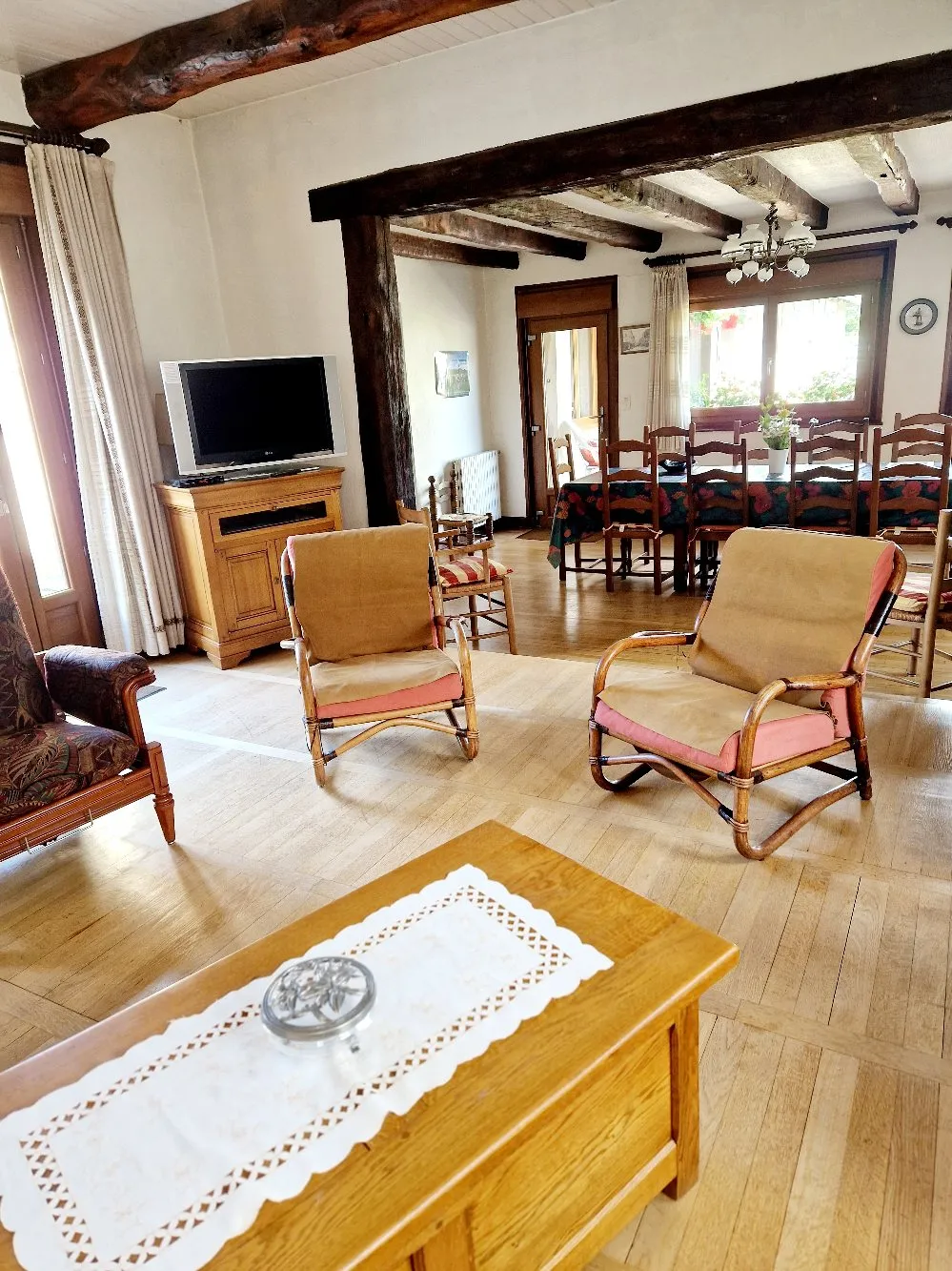 – 5 chambres, idéal pour les grandes familles : trois chambres doubles (2 chambres avec des lits 140×190 et une chambre de 2 lits 90×190) et deux chambres simples (90×190), ainsi qu’un lit bébé. À noter, une des chambres se situe au second étage.