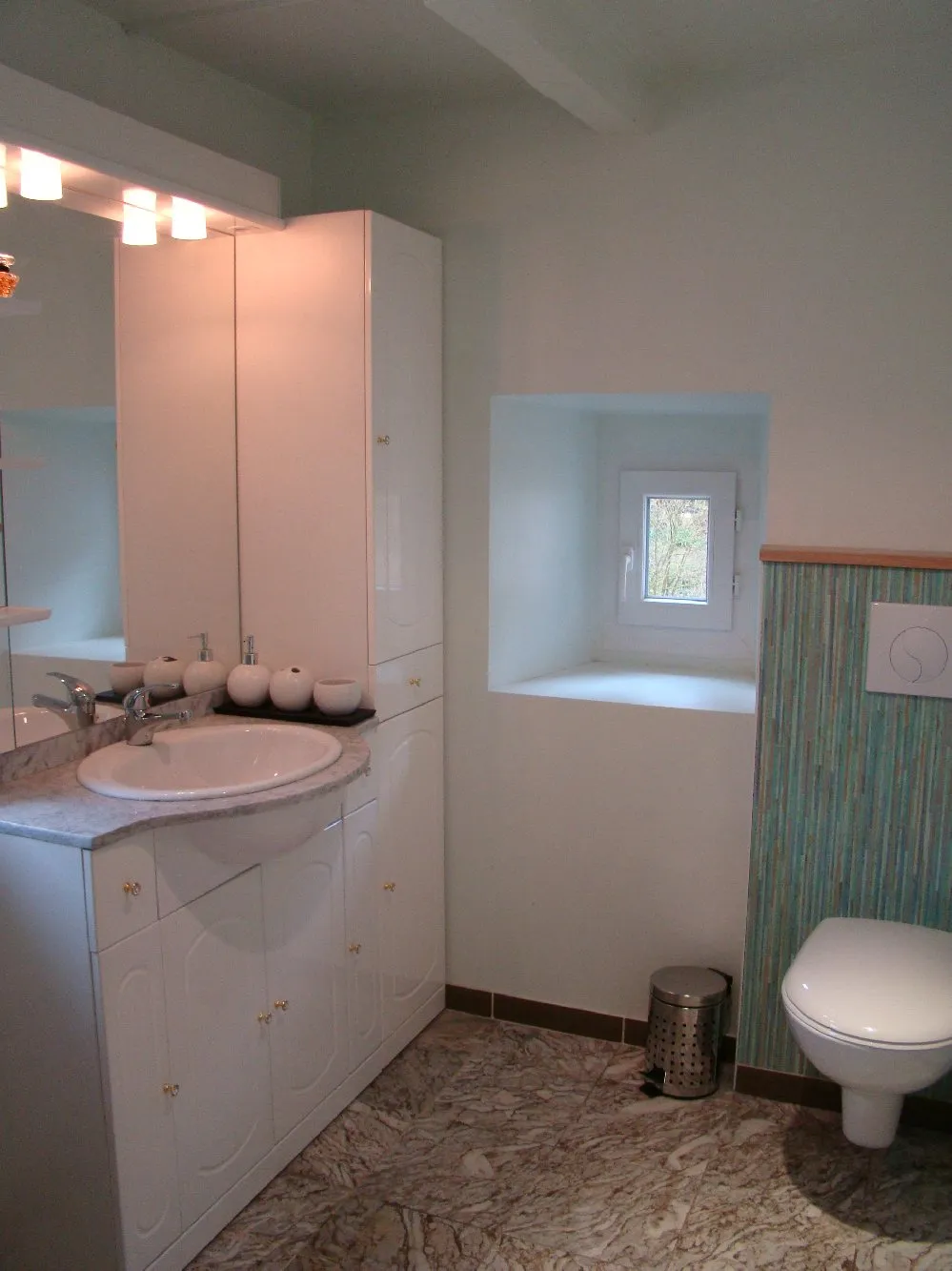 Salle d’eau avec 1 vasque, une douche à l’ Italienne et un WC à l’étage.