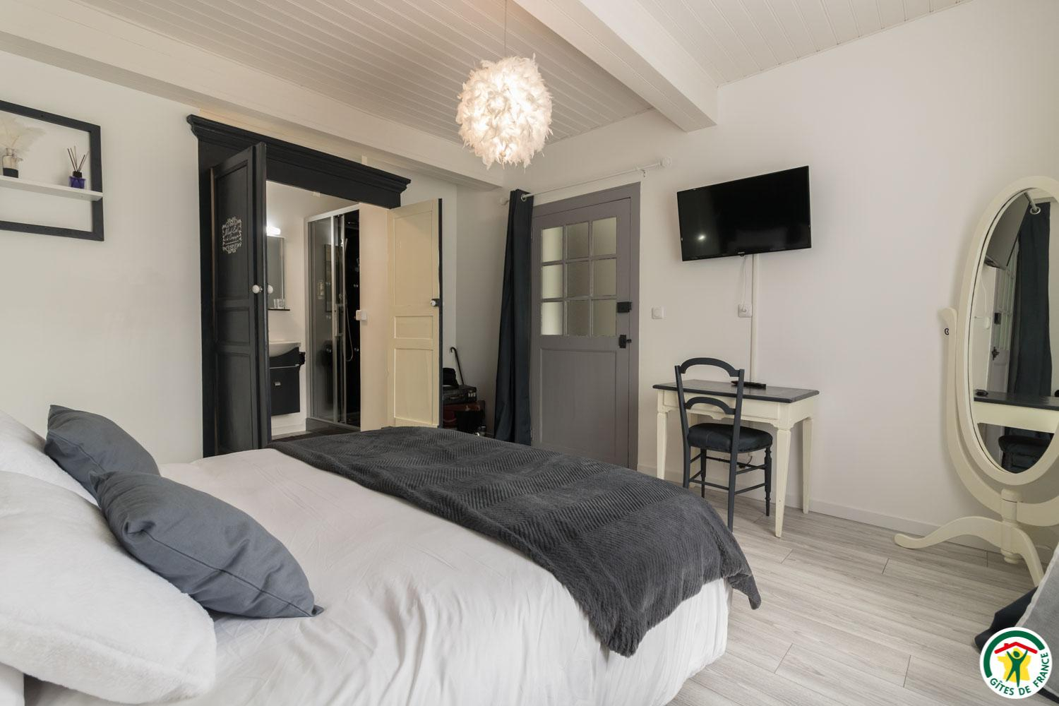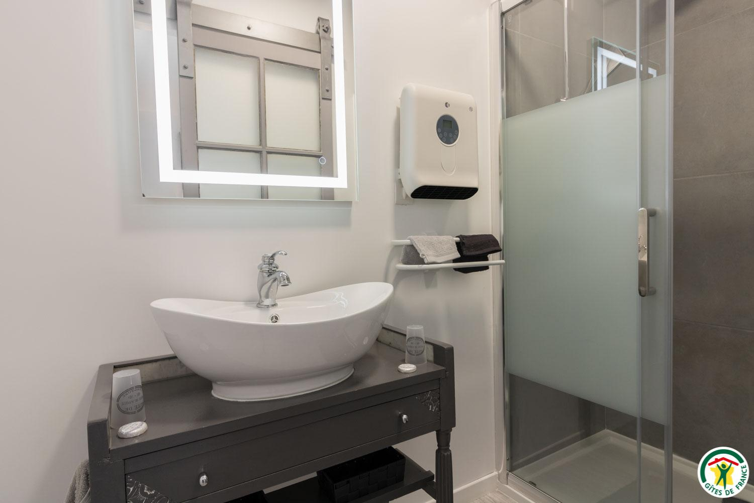 – Au premier étage : 3 chambres (2 lits simple en 90*200cm) (1 lit double en 160*200, salle d’eau) (1 lit double en 140*200, salle d’eau), bureau et documentation touristique dans le couloir, salle de bains, WC séparé.