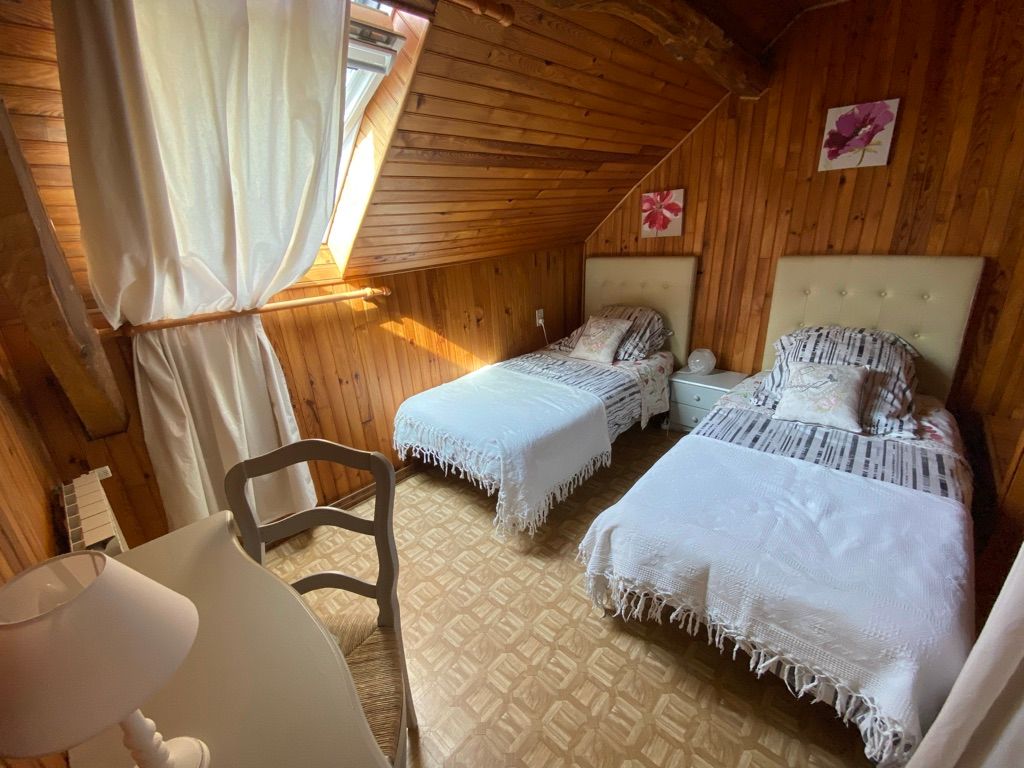 Au rdc : séjour (canapé clic-clac, TV, lecteur DVD) avec coin-cuisine (MO, LL, LV.). Au 1er étage : 2 ch mansardées climatisées dont 1 ch (1 lit 140) et 1 ch (2 lits 90), salle d’eau, WC. Salon de jardin avec barbecue. Jardin ombragé ( non cloturé ) et fleuri avec jeux d’enfants (portique, toboggan). Piscine privé en bois hors sol (diamètre 3m.50, 1.20 de profondeur) . En option : ménage. Le prix comprend : internet (wifi), linge de toilette, de maison et les draps, le bois, le chauffage. A proximité un deuxième logement sans vis-a-vis entre les deux logements