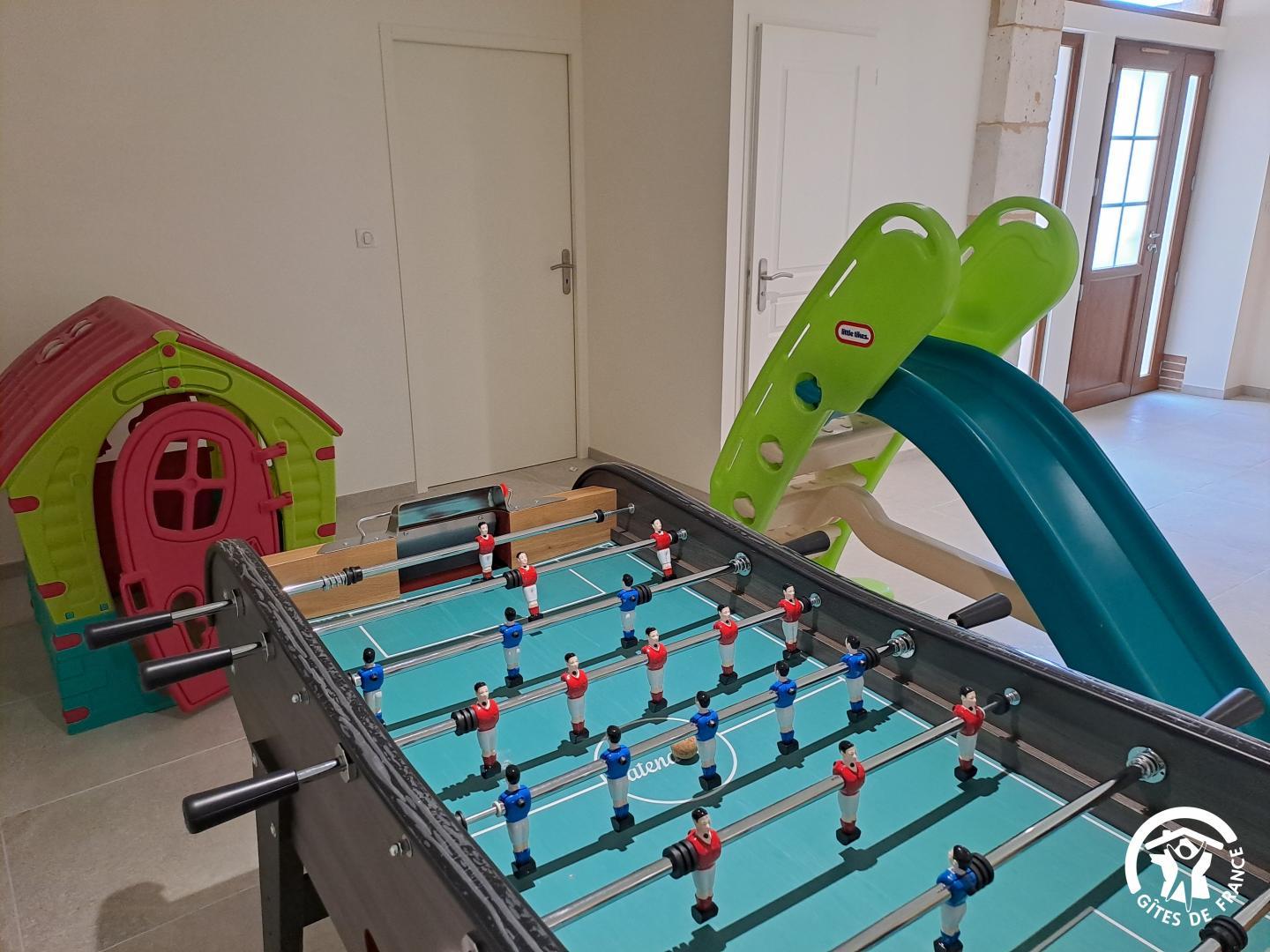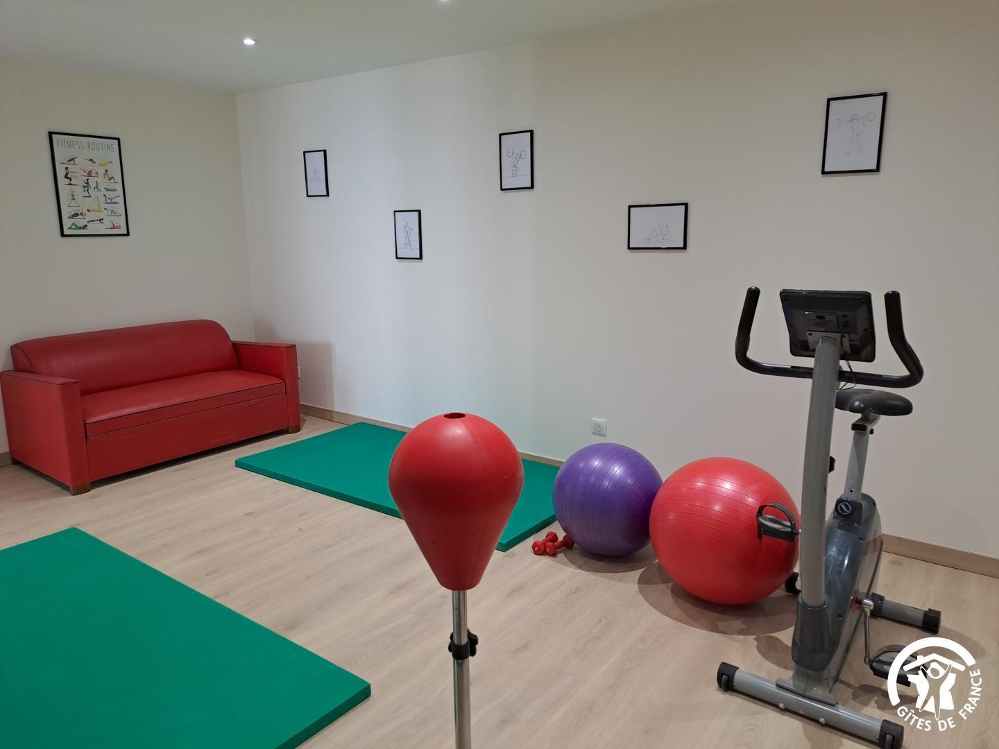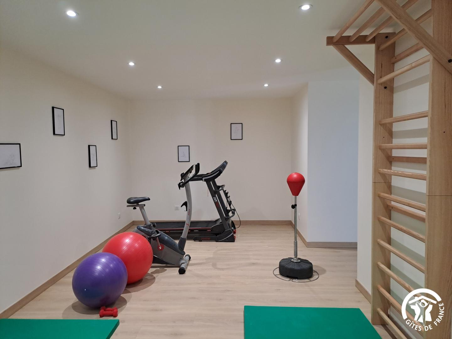 Un escalier mène à un niveau inférieur où petits et grands trouveront de quoi s’amuser et se détendre. Une salle de jeux équipée d’un toboggan, d’une cabane et d’un babyfoot fera le bonheur des enfants. Les plus sportifs profiteront d’une salle de sport avec barre de tractions, tapis de sol, vélo électrique, tapis de course et punching-ball. A côté :