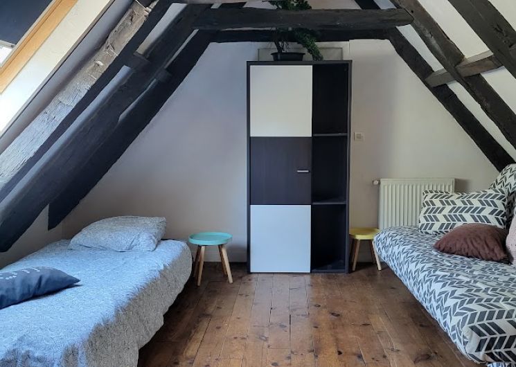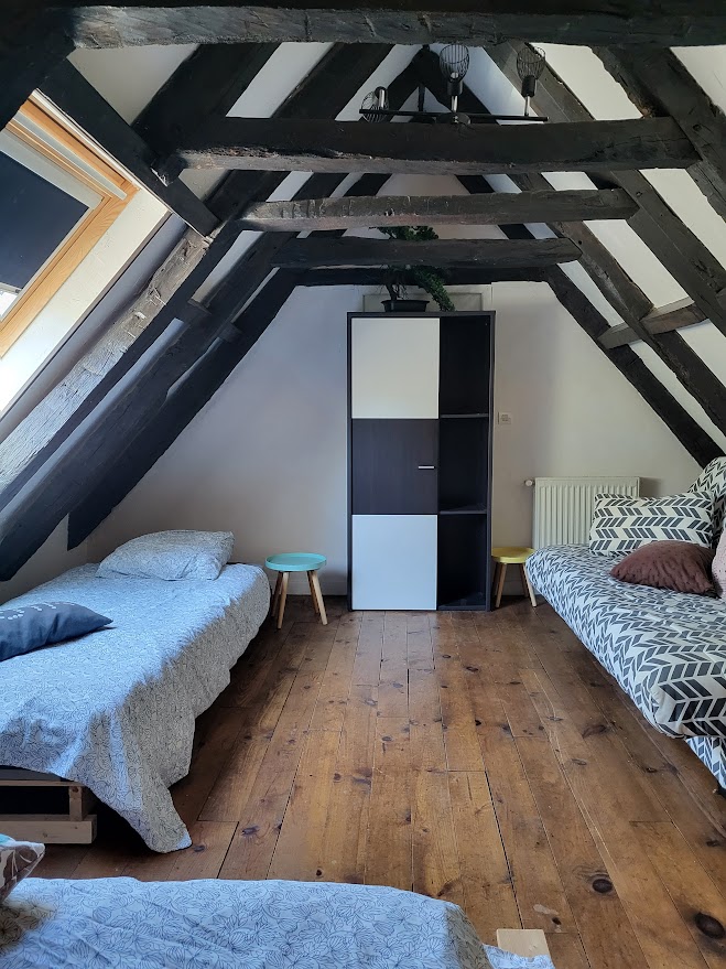 A rez de chaussée, vous entrez dans une belle pièce à vivre avec son coin cuisine et un très vieil évier en pierre , la partie séjour avec le poêle a bois et le canapé puis les 2 grandes chambres et la partie sanitaire comprenant la salle de bain , les WC et la buanderie . A l’étage, sous les combles , la chambre dite : » des enfants » avec les poutres apparentes .