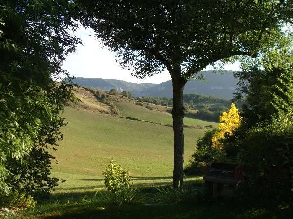 Le gîte s’ouvre sur une terrasse avec salon de jardin. Une pelouse avec fauteuil relax et barbecue descend vers pré et champ. Au-delà, un magnifique paysage champêtre avec en arrière-plan l’entrée des Gorges du Tarn bordé par les falaises du Causse Noir. Le hameau de Solanes est dans la nature : vous pourriez voir devant le gîte, au bas du pré, un troupeau de brebis au printemps ou à l’automne mais aussi surprendre: chevreuils, sangliers, renards. Dans le ciel il n’est pas rare d’observer vautours, faisans, perdrix. On entend le soir la chouette hululée. Et plus tard dans la nuit vous pouvez admirer le magnifique ciel étoilé sans être gêné par la pollution lumineuse.