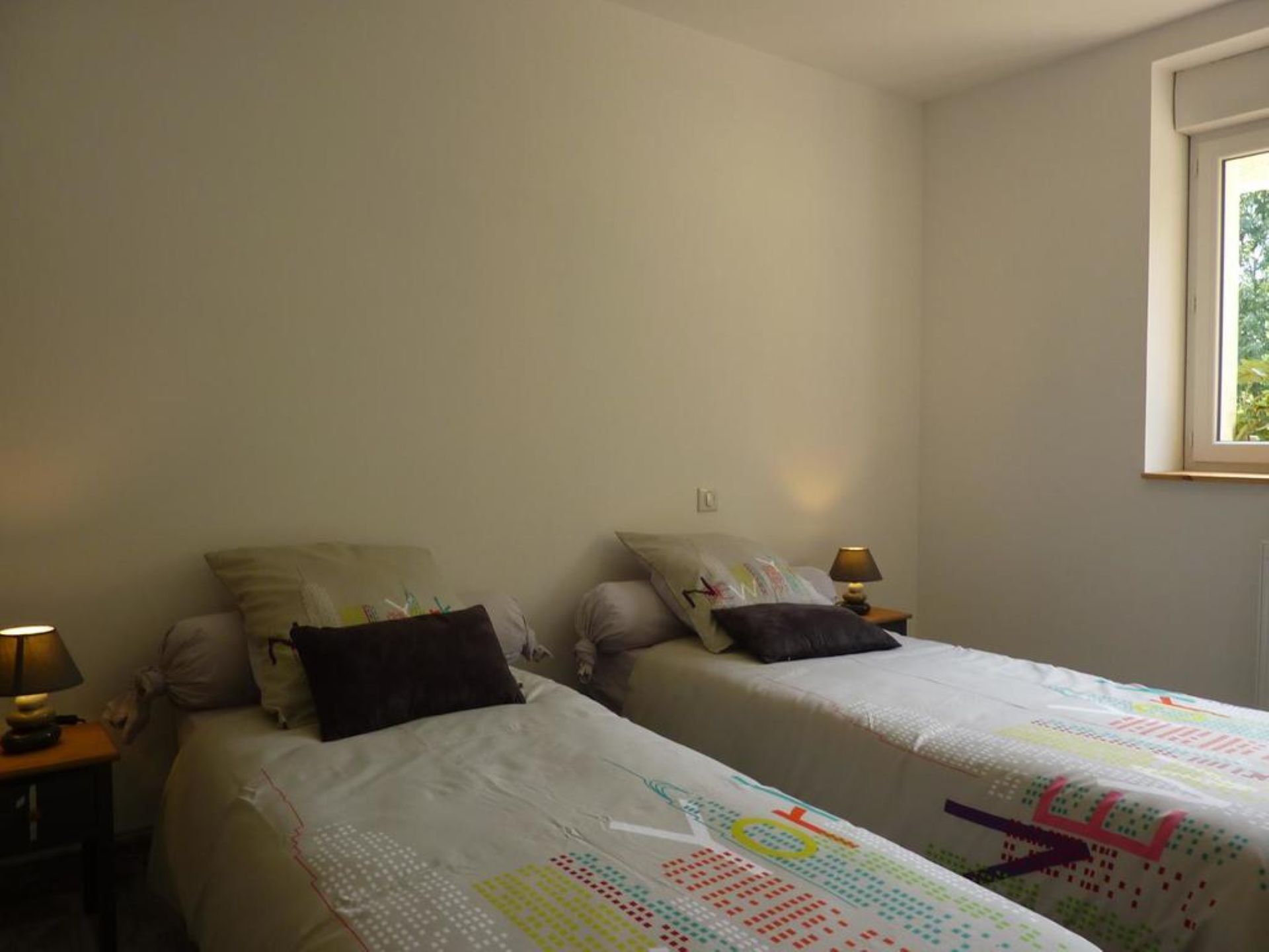 Chambres : Une chambre avec un lit double (180 cm) et une salle d’eau avec toilettes, et une deuxième chambre avec trois lits simples (deux lits peuvent être rapprochés pour former un lit double de 160 cm). Un lit bébé peut être fourni sur demande.