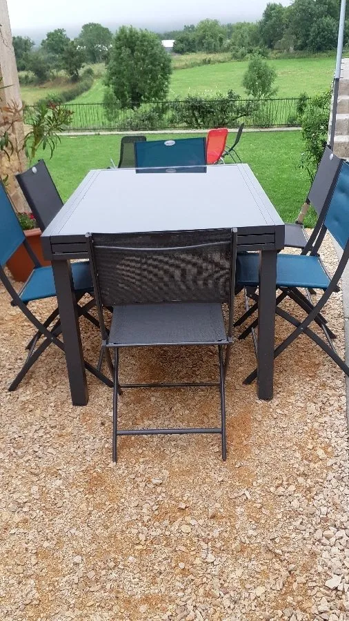 A l’extérieur, cour fermée, terrain avec coin privatif, salon de jardin, barbecue, transats, trampoline partagé.