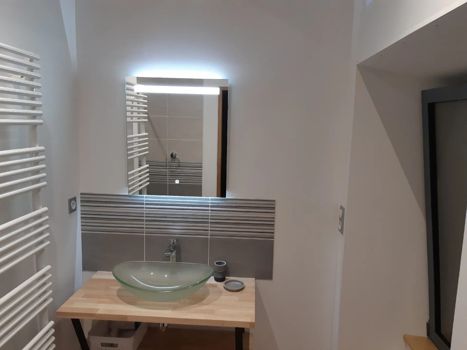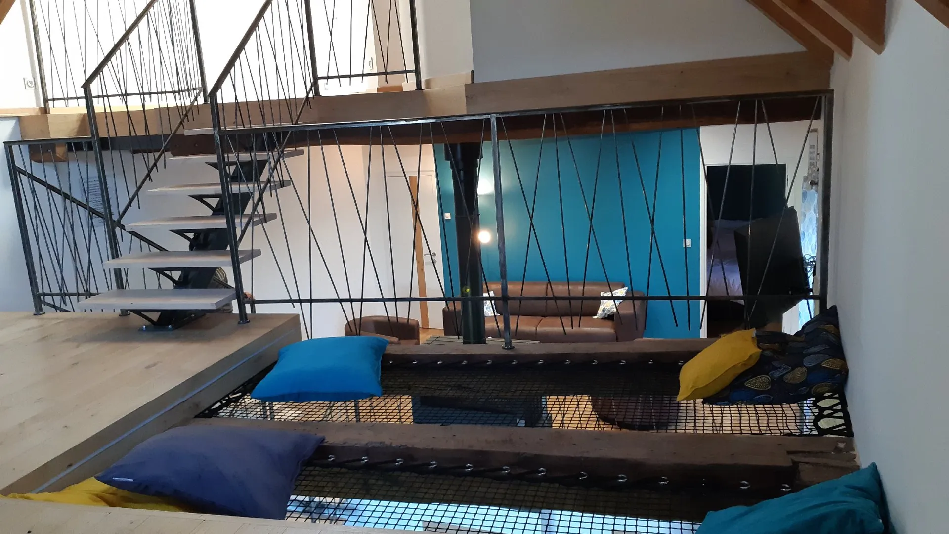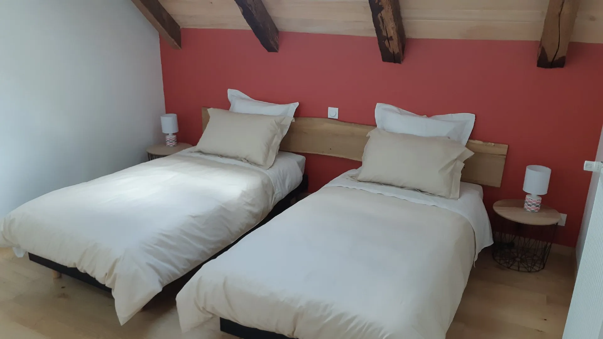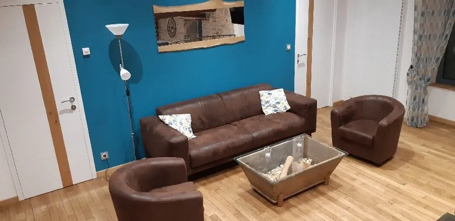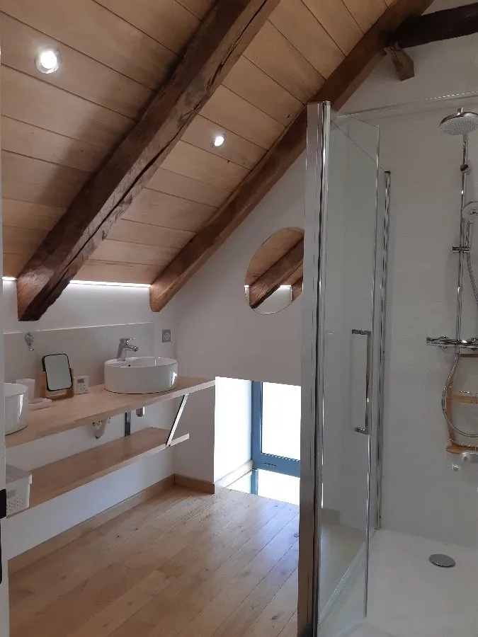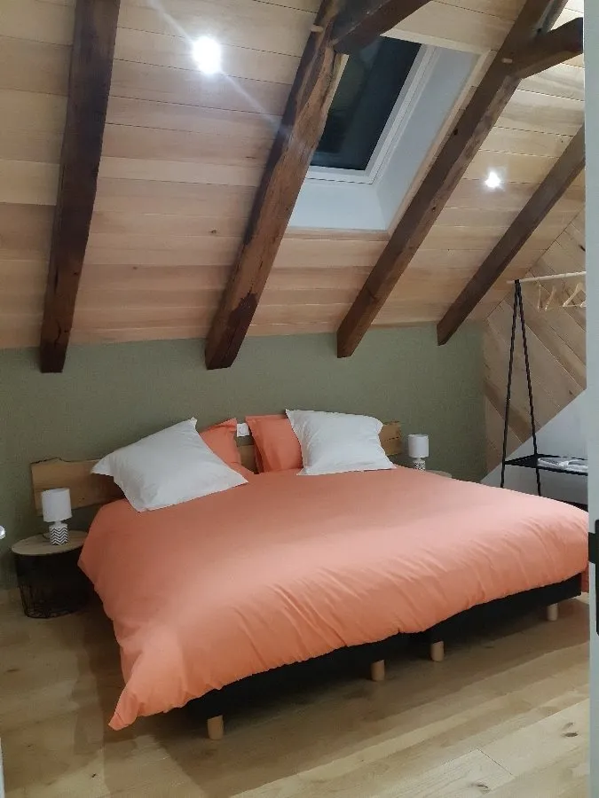 Gîte indépendant avec cuisine équipée (cafetière classique et Senseo) et séjour ouverts en demi-niveau, poêle à bois central à double vision et chauffage central. Sur le même palier 1 chambre lit en 160cm, TV et salle d’eau privative, WC indépendant. Au 2ème demi-niveau : un coin repos avec filet d’intérieur, bibliothèque, coin bureau et clic-clac (pouvant accueillir 2 personnes supplémentaires moyennant un coût suppl. de 15€/jour/pers). Au 3ème demi-niveau : 2 chambres avec 2 lits en 90 ou 1 lit en 180cm, WC indépendant, salle d’eau 2 vasques et douche italienne. Sous-sol avec coin buanderie (lave-linge, sèche-linge).