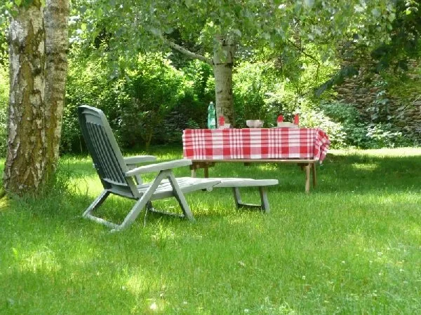 Jardin privatif avec terrasse couverte, table de pique-nique et barbecue.