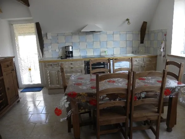 Appartement neuf dans maison (3 appartements) 4/5 personnes – 45 m². 1er étage : séjour (télévision, insert, clic-clac) avec cuisine équipée (micro-ondes, lave-vaisselle), 1 chambre (1 lit 140), mezzanine (1 lit 140). Salle d’eau, WC. Lave-linge, chauffage électrique. Terrasse (salon de jardin, barbecue), cour, animaux bienvenus.