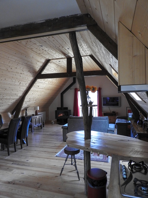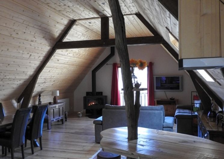 Appartement de 70 m² situé à l’étage de notre logement personnel, avec accès indépendant, comprenant : Une cuisine équipée, un salon/salle à manger avec poêle à bois et canapé convertible (en 160), une chambre (2 lits en 90) avec salle d’eau (douche, lave-linge et sèche-cheveux à disposition) et WC. La location bénéficie d’une petite terrasse à partager.