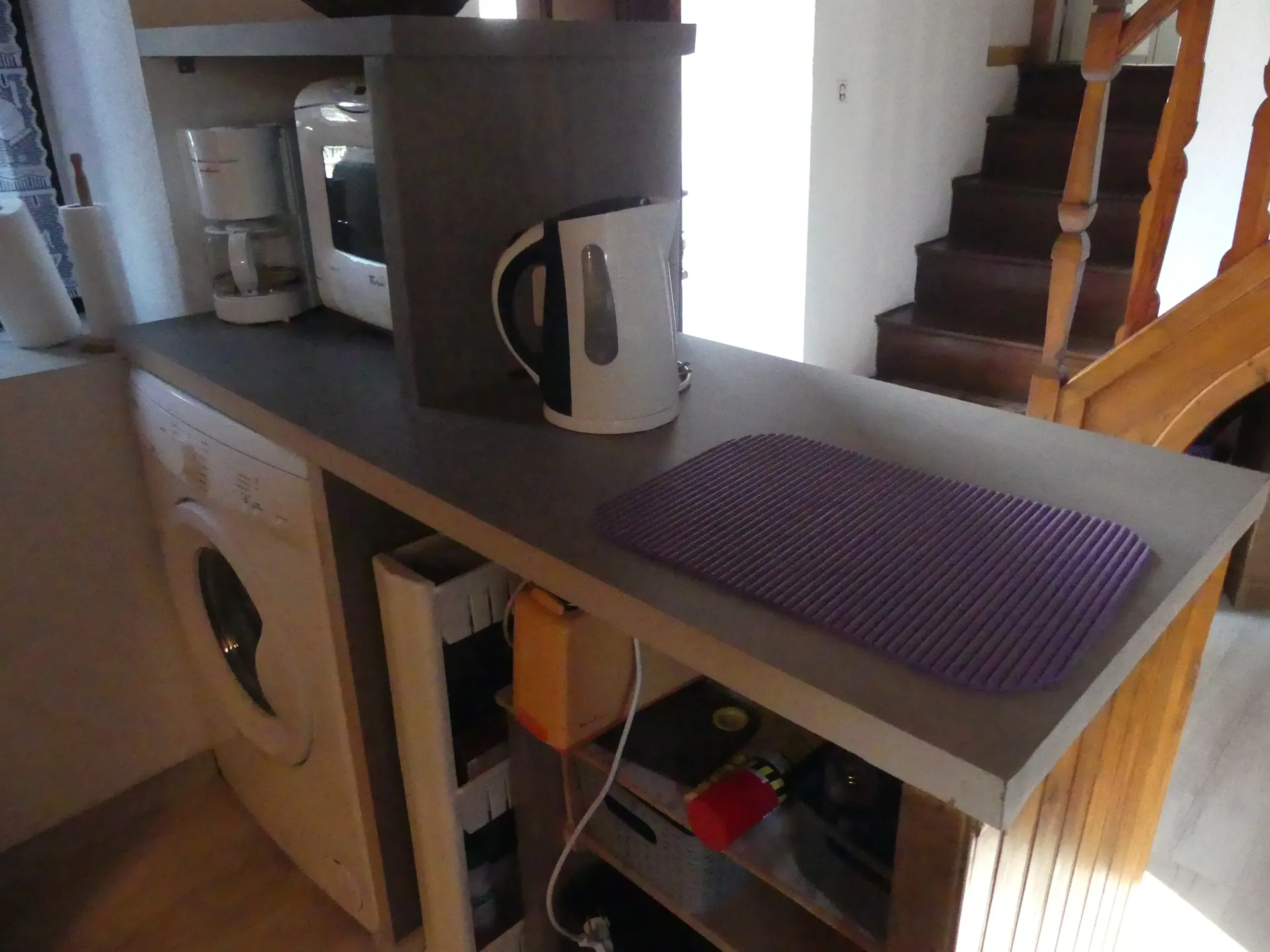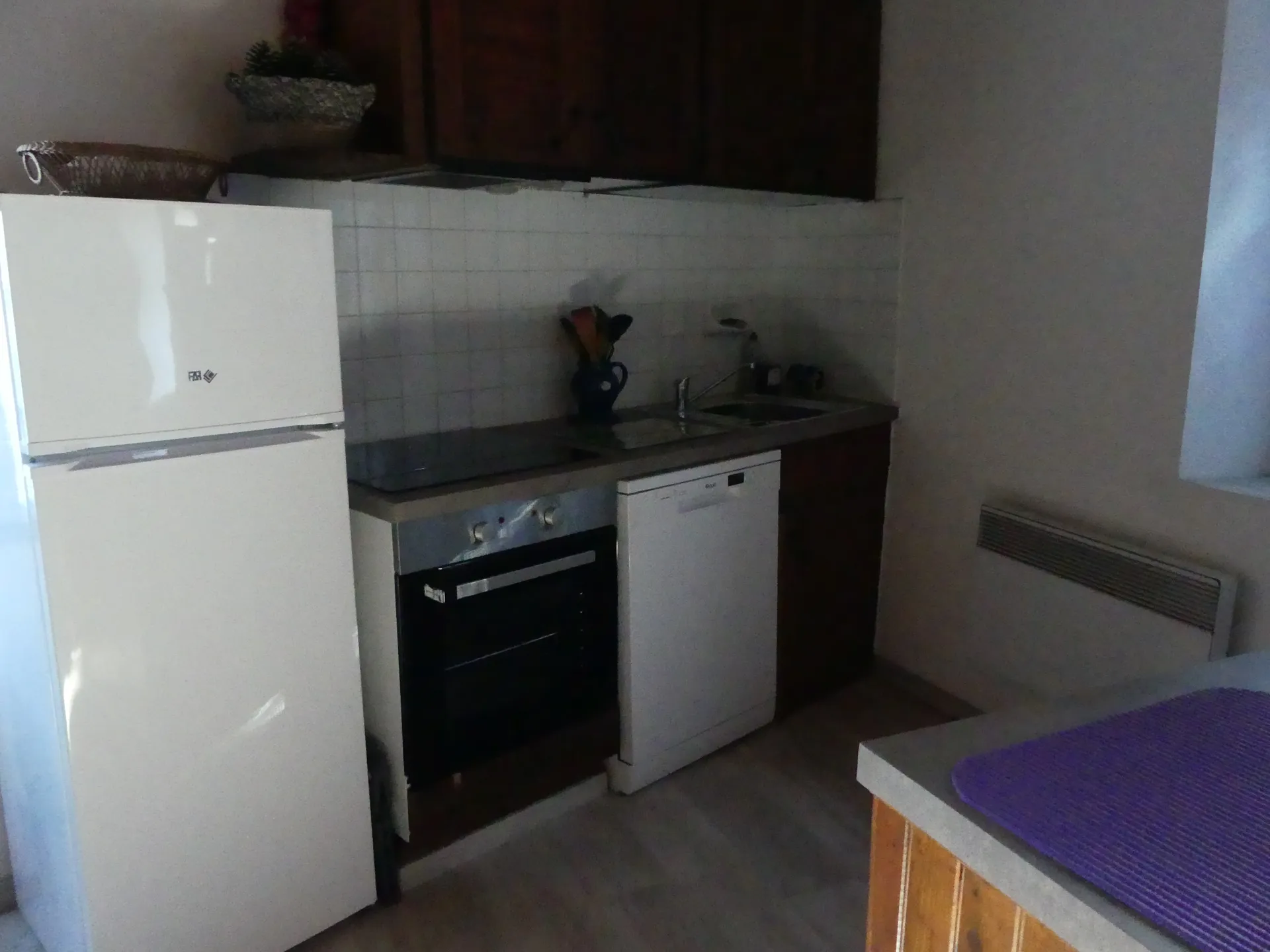 Equipements cuisine : Frigo avec petit congélateur, Plaque et four, Four micro-ondes, lave vaisselle et lave linge