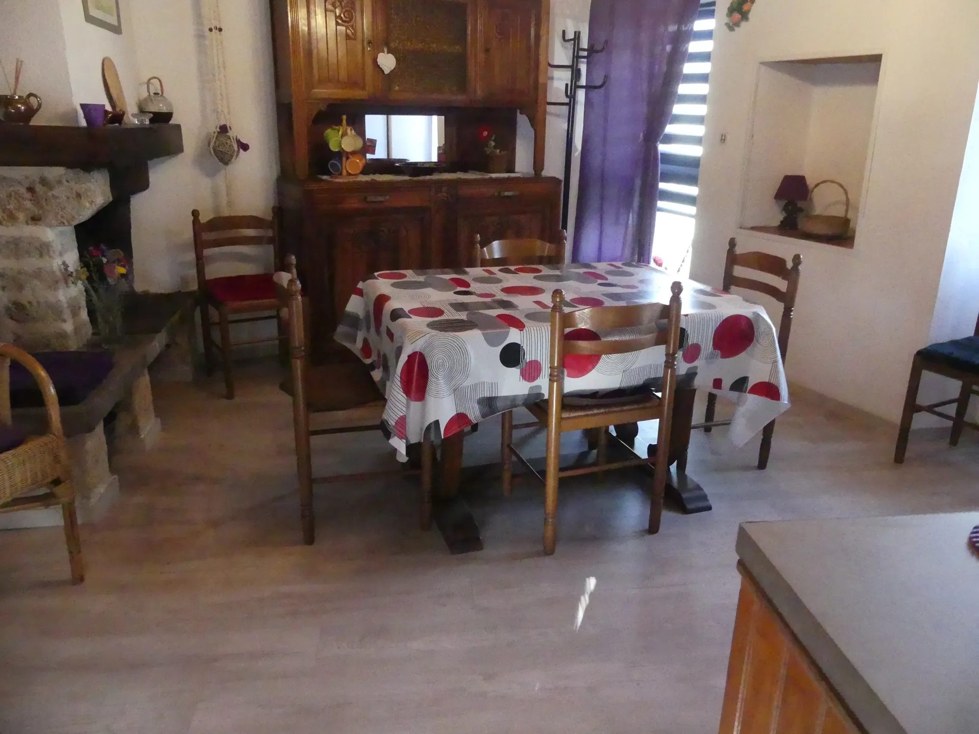 Au rez-de-chaussée surélevé : Séjour (prise TV) et cuisine américaine – Au 1/2 étage : coin salon (clic-clac) avec accès salle d’eau et WC indépendants – Au 1er étage : 2 chambres séparées (1 lit 140, 2 lits 90) –