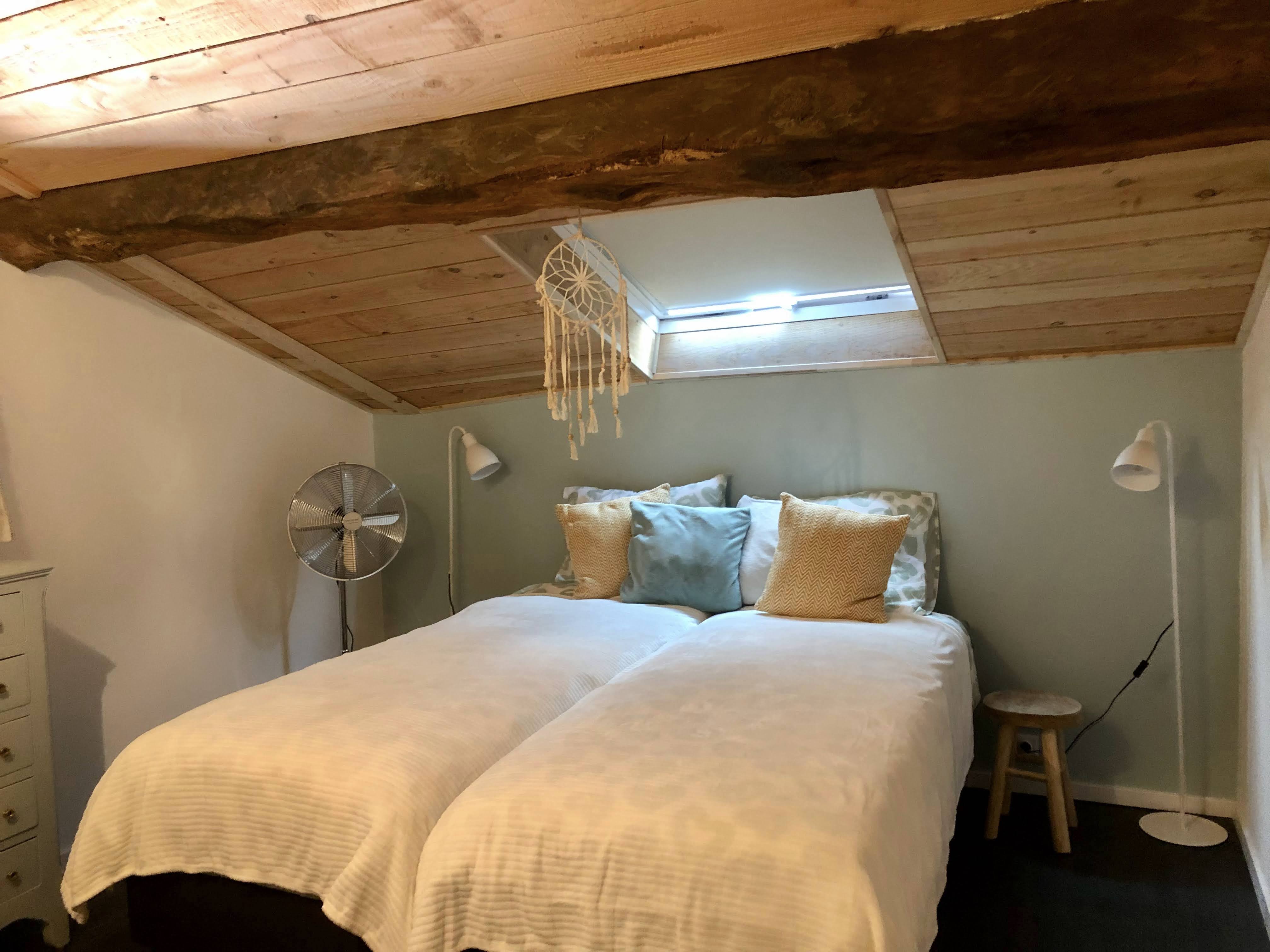 À l’étage, deux chambres, dont l’une avec des lits à sommiers pouvant être rapprochés pour former un deuxième lit double (160 x 200 cm), et l’autre avec deux lits simples (90 x 200 cm).